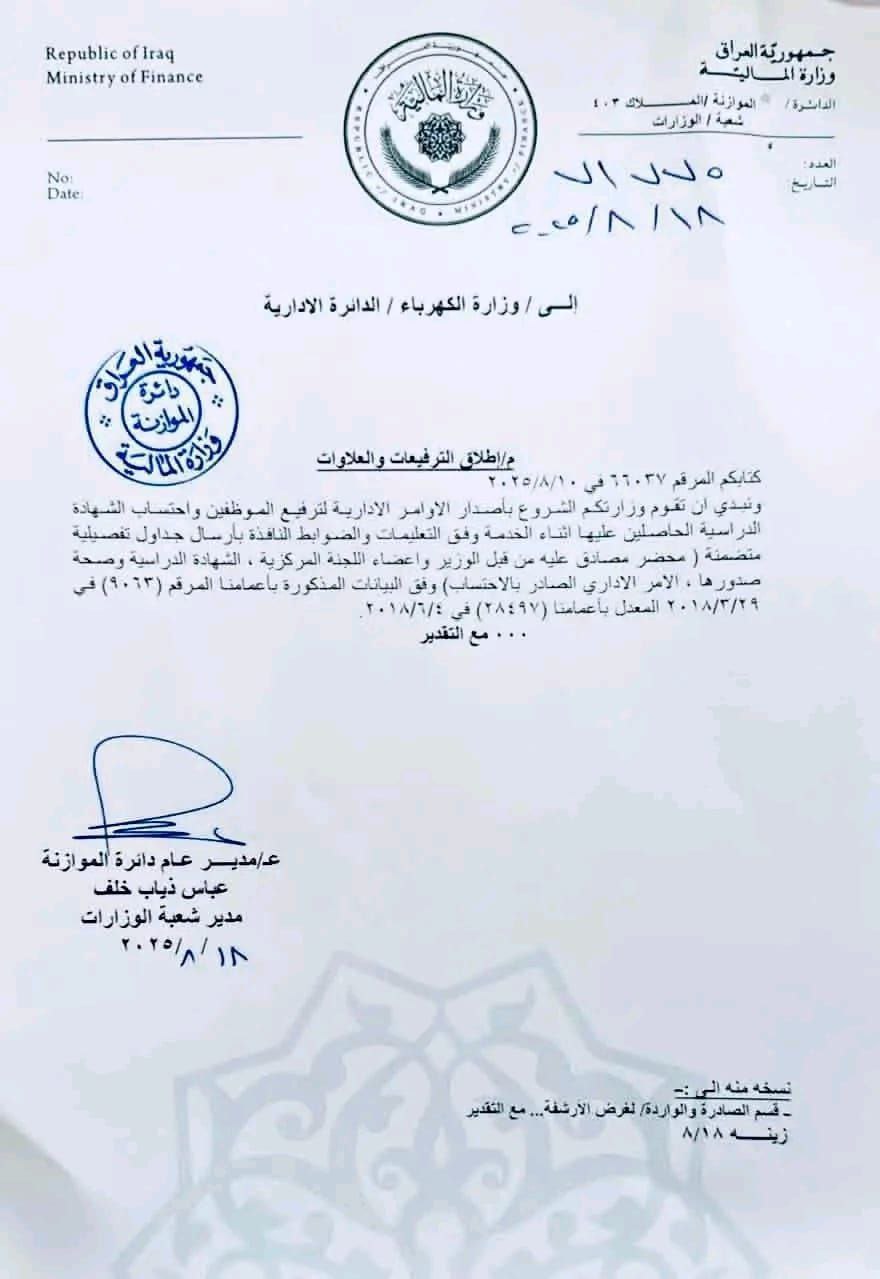 المالية تطلق الترفيعات والعلاوات واحتساب الشهادات لموظفي الكهرباء