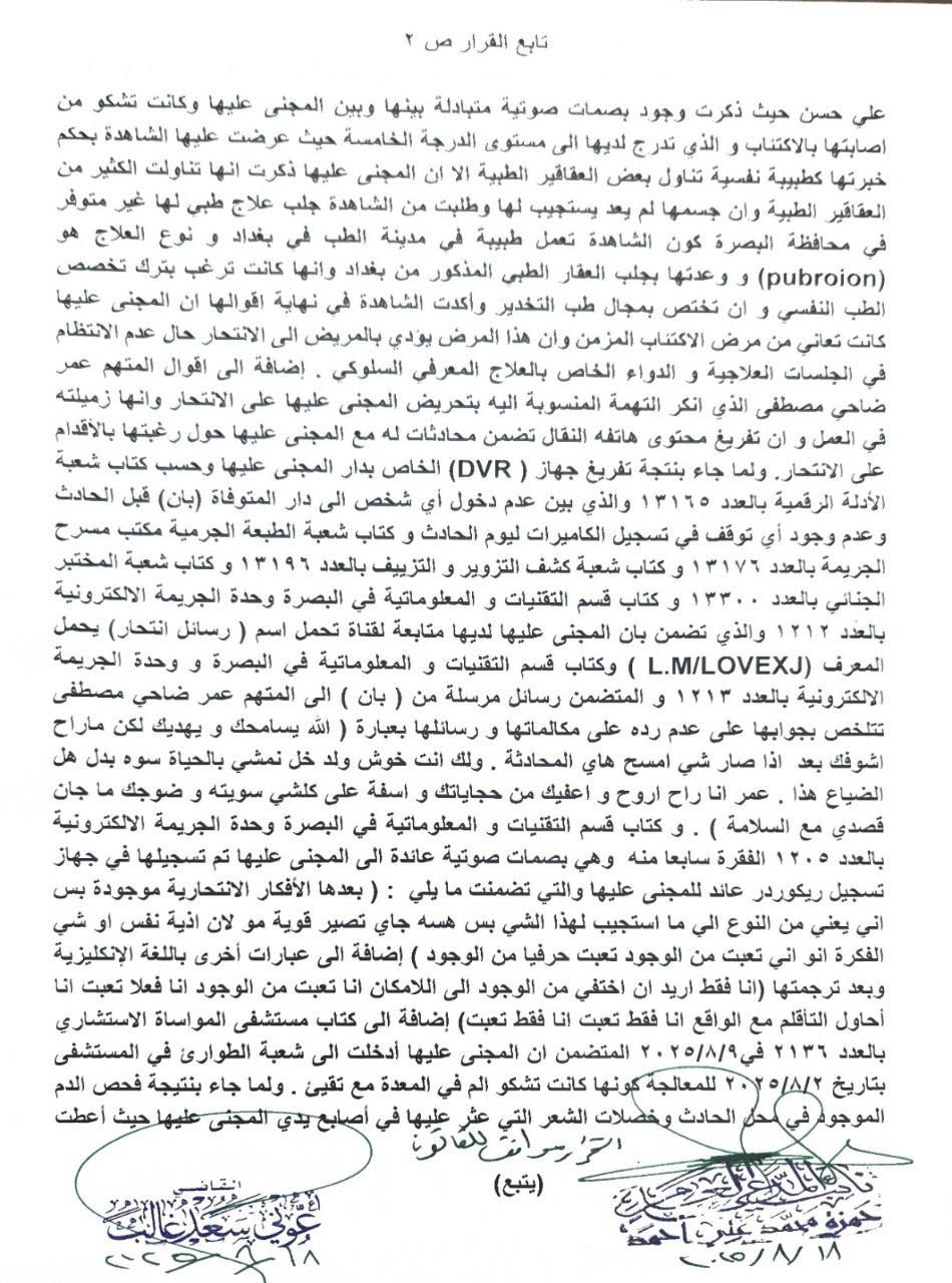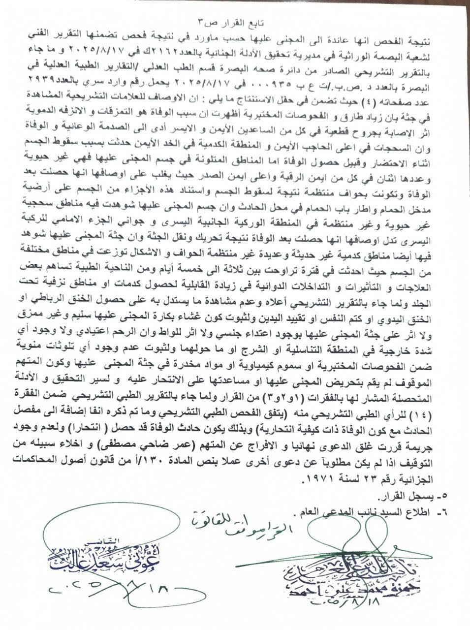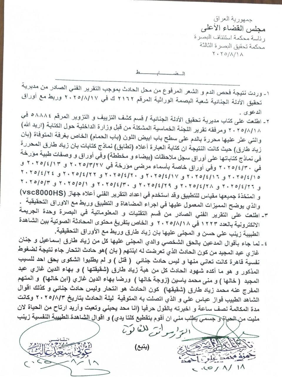 وقال المركز الإعلامي لمجلس القضاء الأعلى في بيان تلقته (الغدير)، إن “رئاسة محكمة استئناف البصرة أرسلت إلى مكتب رئيس المجلس القرار الخاص بوفاة الطبيبة بان زياد والذي يتضح من خلال حيثيات القرار أن الحادث انتحار”.