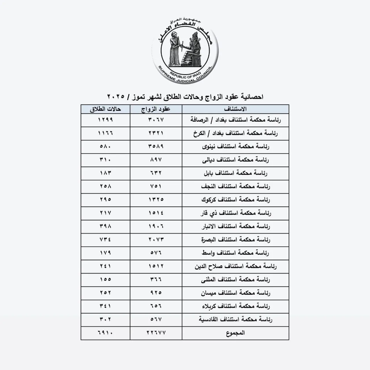 أعلن مجلس القضاء الأعلى، اليوم الأحد، إحصائية الزواج والطلاق لشهر تموز لسنة 2025.