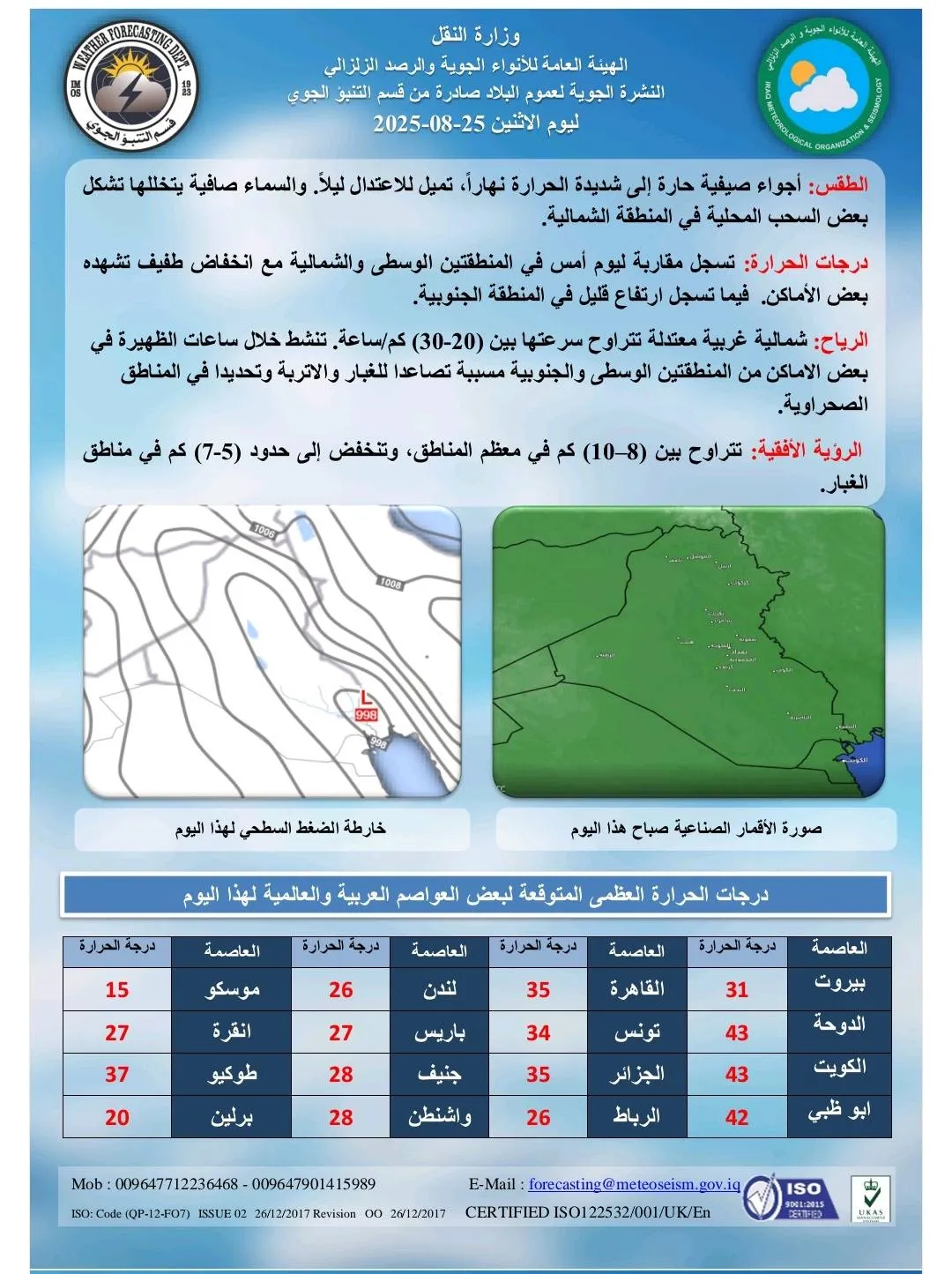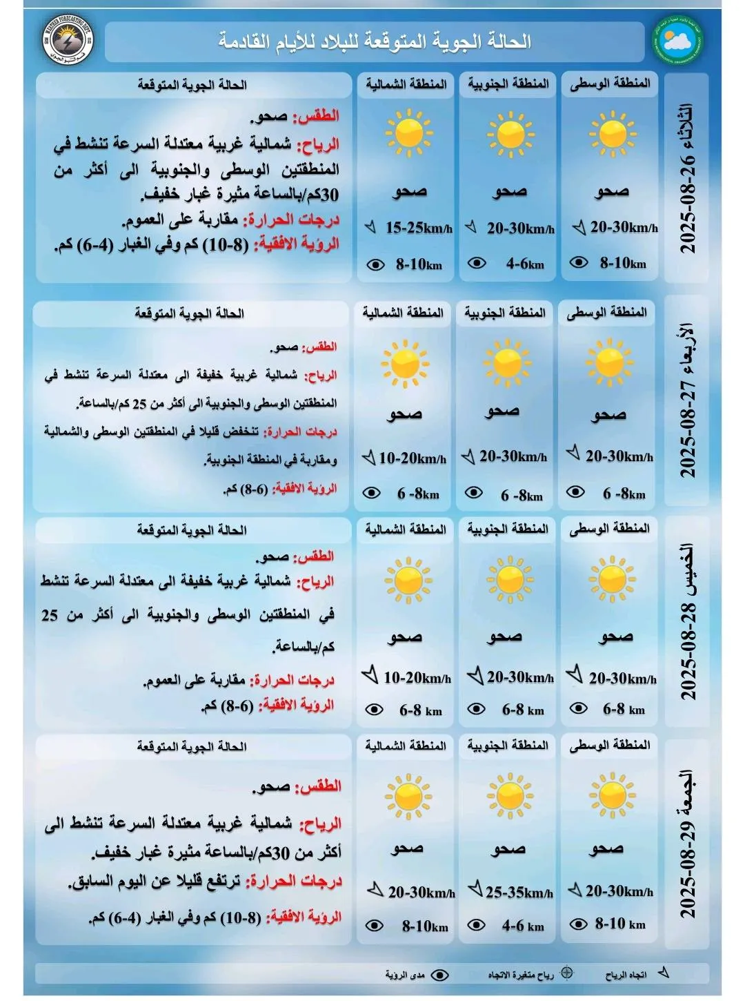 أعلنت الهيئة العامة للأنواء الجوية، اليوم الإثنين، حالة طقس العراق خلال الأيام المقبلة.