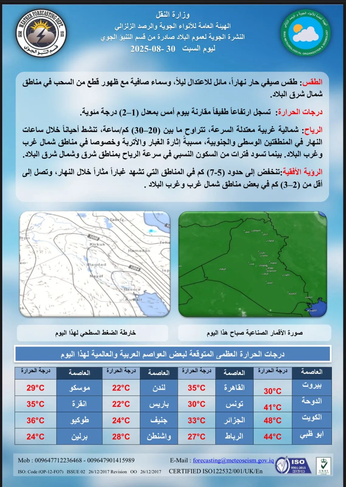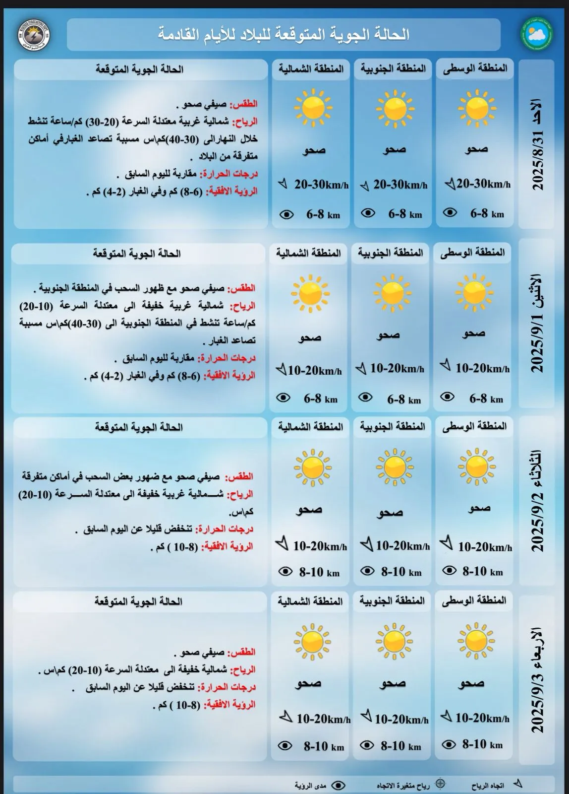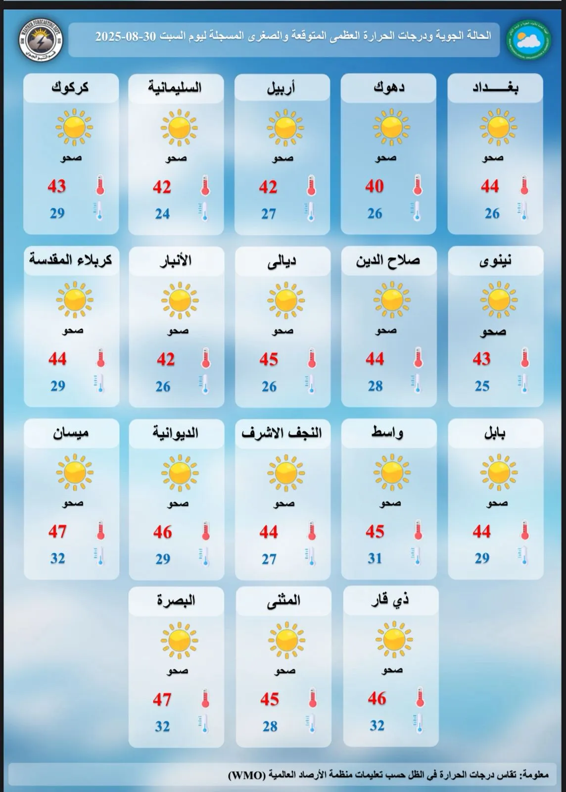 أعلنت هيئة الأنواء الجوية، اليوم السبت، حالة طقس العراق خلال الأيام المقبلة، فيما أشارت إلى استمرار انخفاض درجات الحرارة.