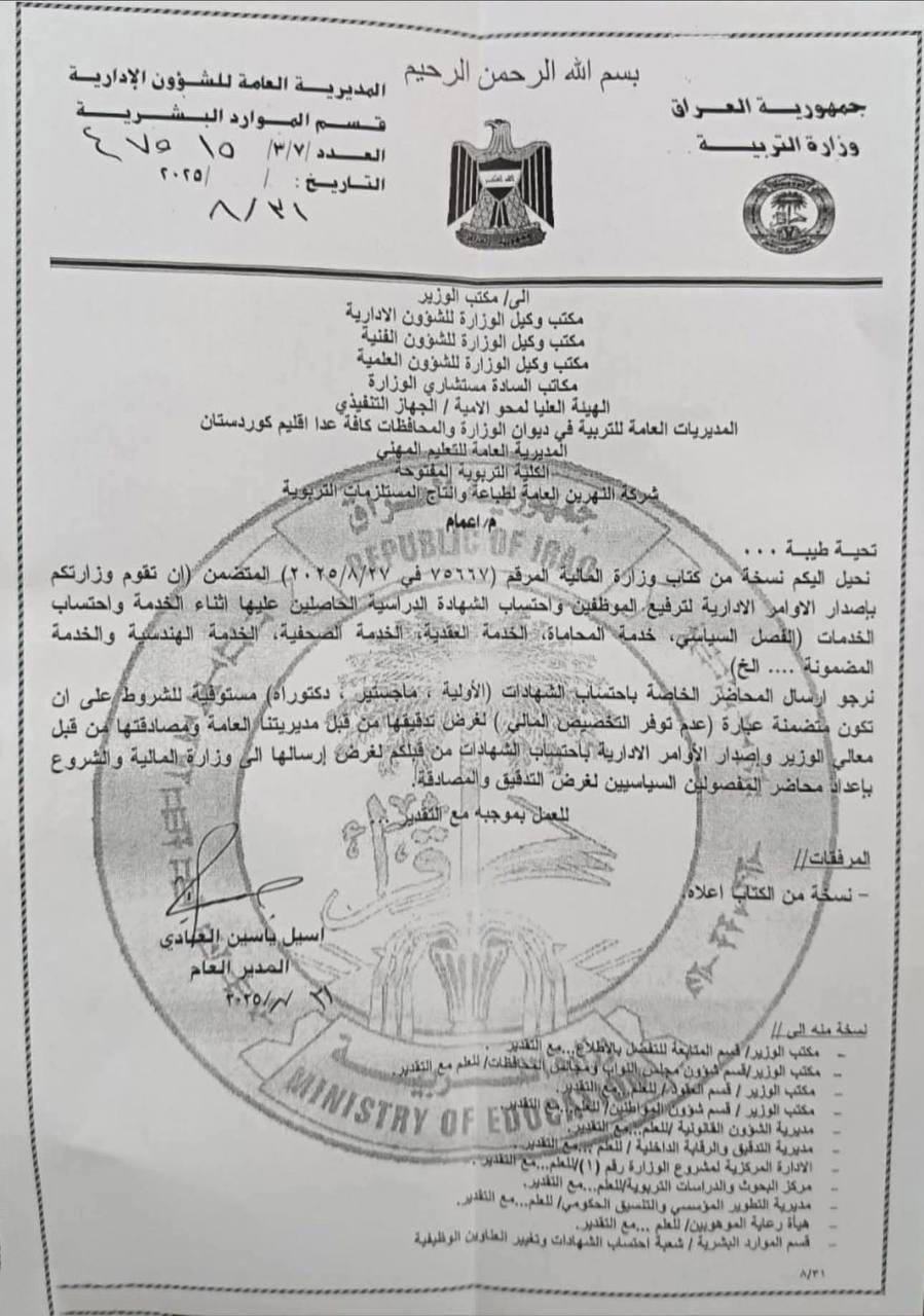 التربية توجه بإصدار أوامر لترفيع الموظفين واحتساب الشهادات والخدمة