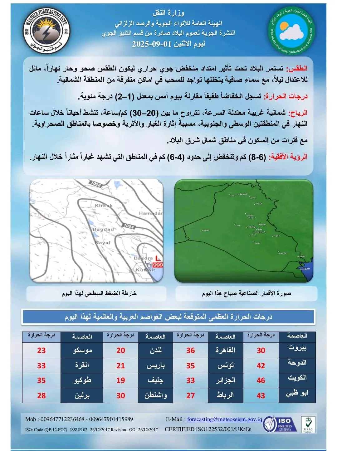 أعلنت هيئة الأنواء الجوية، اليوم الإثنين، عن حالة الطقس في البلاد للأيام المقبلة، فيما توقعت استمرار انخفاض درجات الحرارة في عموم مناطق البلاد.