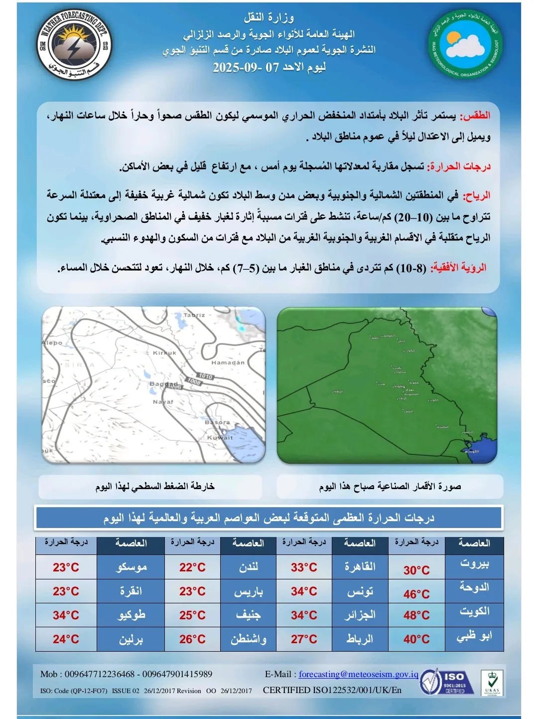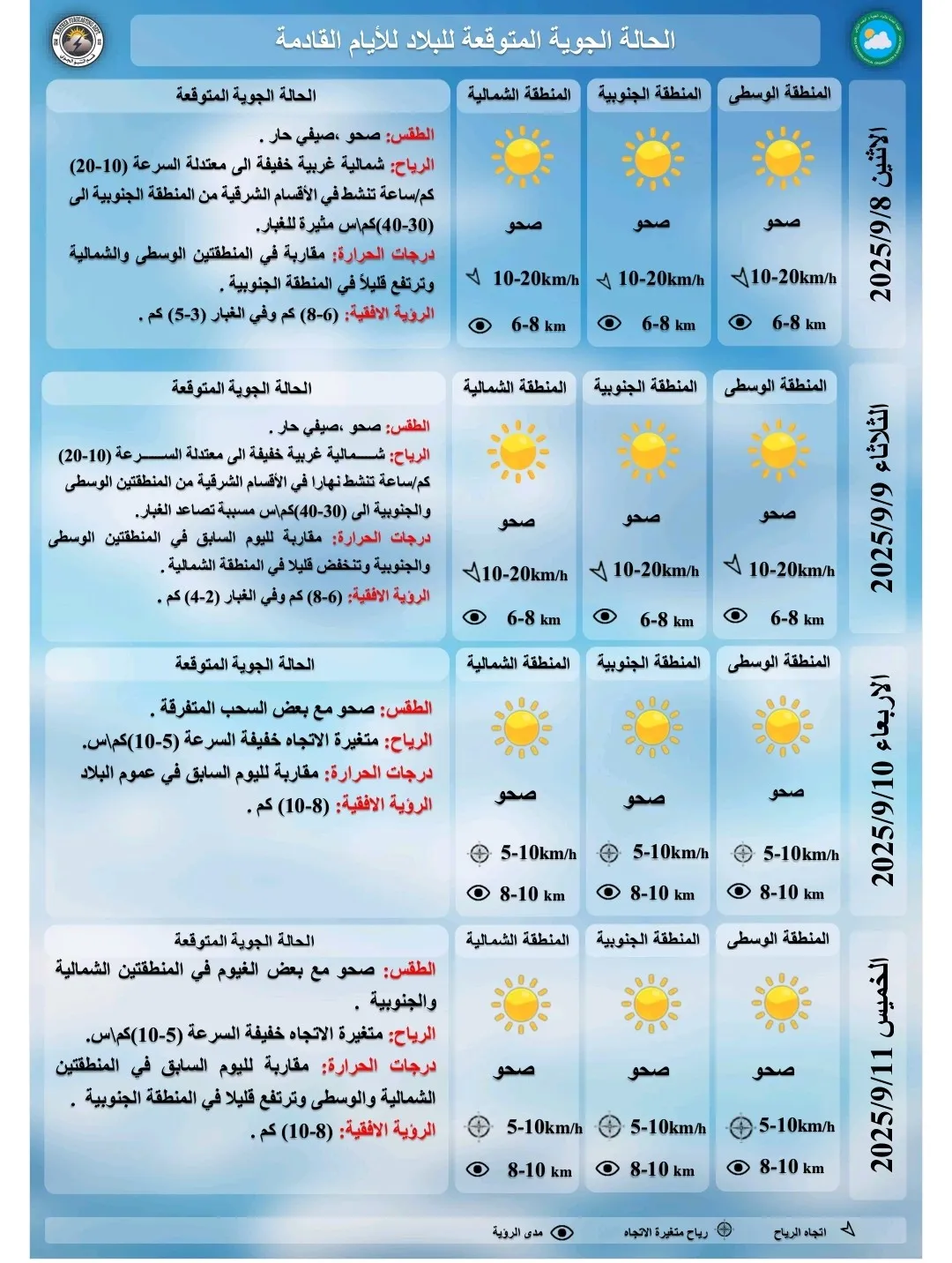 أعلنت هيئة الانواء الجوية، اليوم الأحد، حالة طقس العراق خلال الأيام المقبلة.