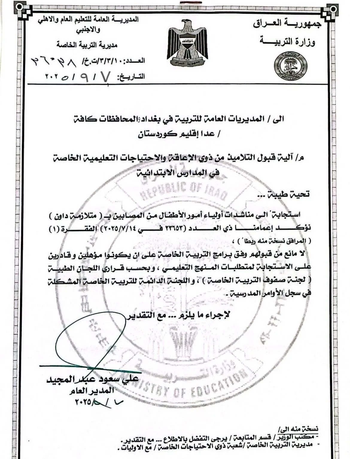 وجه وزير التربية، ابراهيم نامس الجبوري، بقبول الاطفال المصابين (بمتلازمة داون) في المدارس الابتدائية.