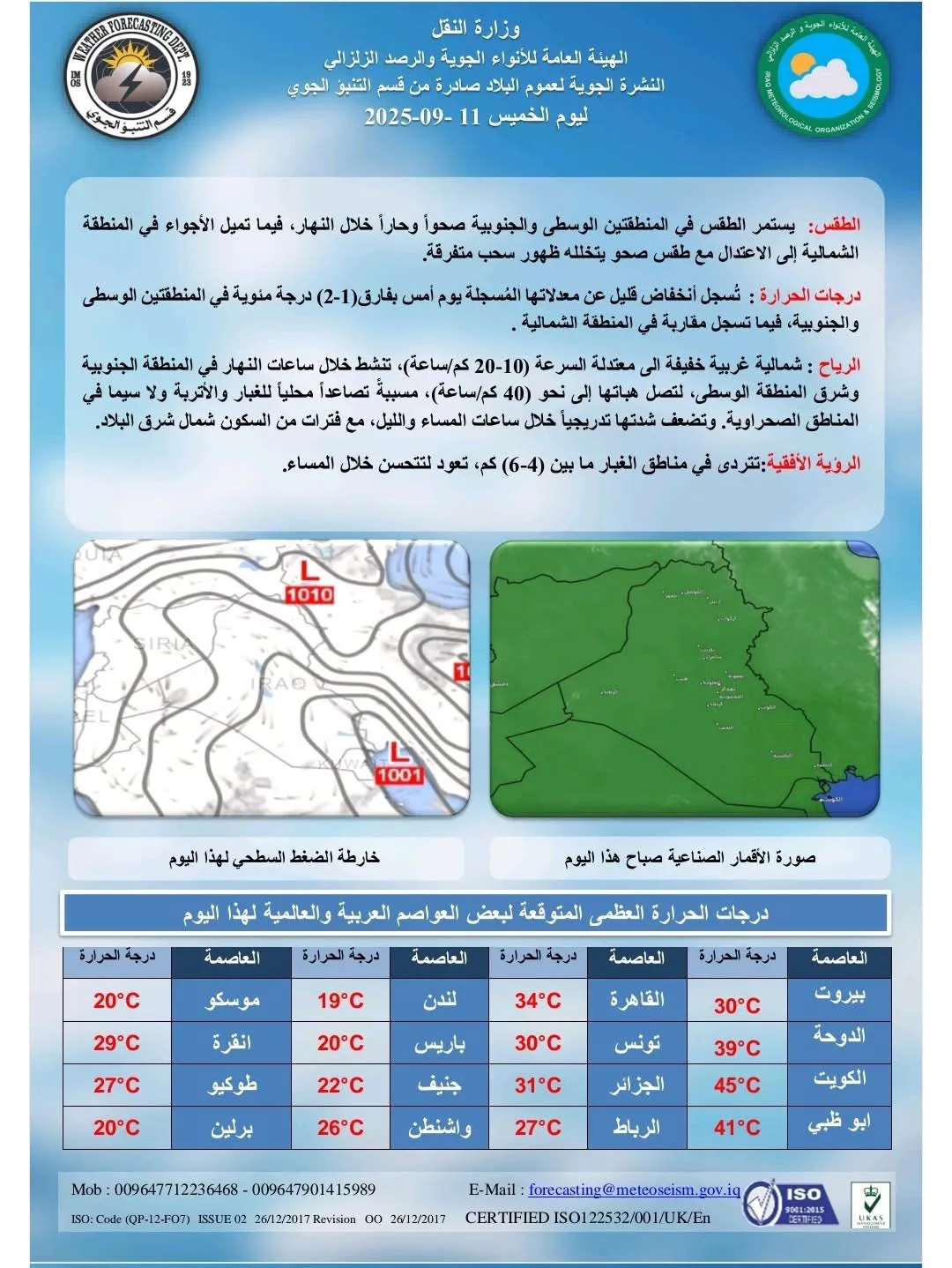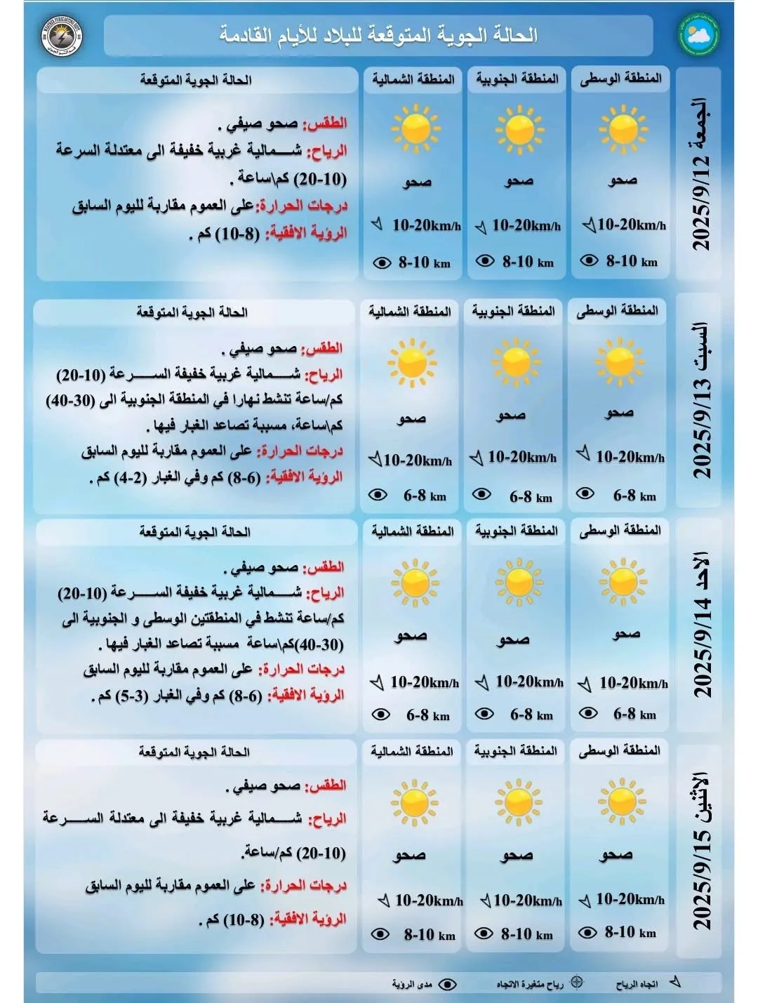 توقعت هيئة الأنواء الجوية، ان يكون طقس البلاد معتدل الحرارة.