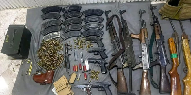 وأضاف البيان، أن “عمليات التفتيش أسفرت عن ضبط عدد من الأسلحة والأعتدة وهي ضبط (4) بنادق كلاشنكوف، و(8) بنادق صيد، و(3) مسدسات، و(14) مخزن بندقية كلاشنكوف، و(3) مخازن مسدسات، و(550) اطلاقة عتاد مختلف، ودرع عدد (2) وحربة عسكرية”.