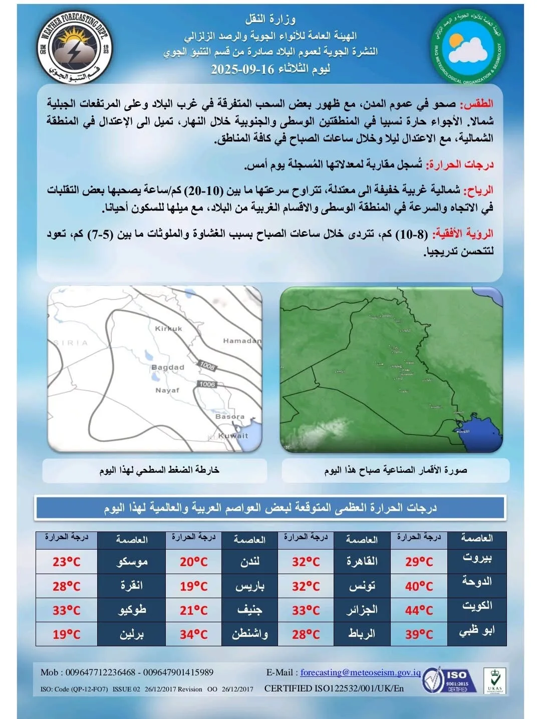 توقعت هيئة الأنواء الجوية، تراجع درجات الحرارة بالعراق.