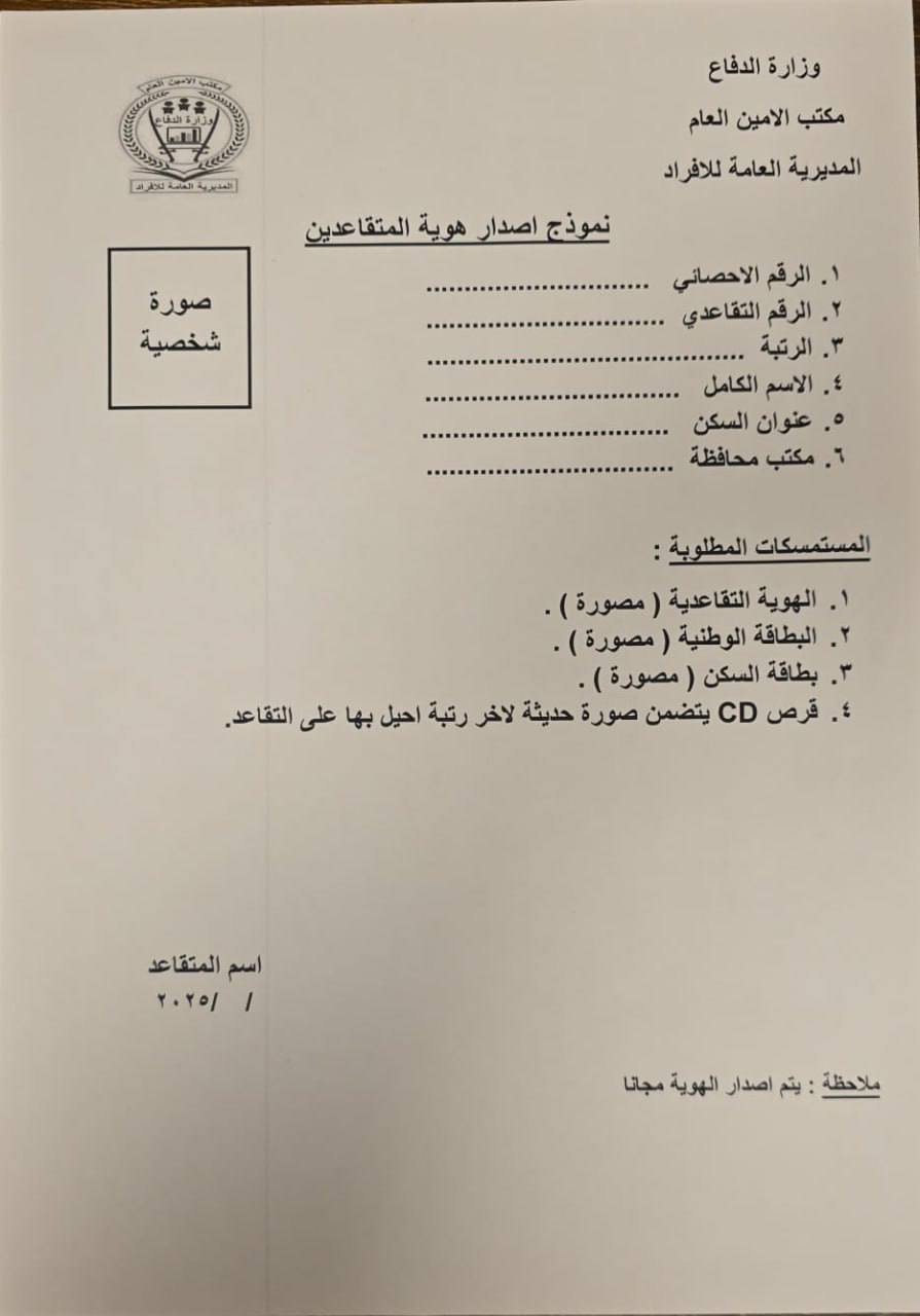 ودعت المديرية، المشمولين إلى مراجعة الأقسام المذكورة في محافظاتهم مع الوثائق المطلوبة، والتي تشمل الهوية التقاعدية، والبطاقة الوطنية الموحدة (أو بطاقة السكن)، وصورة شخصية حديثة، وآخر رتبة عسكرية احيل بها على التقاعد محملة على قرص مدمج (CD).