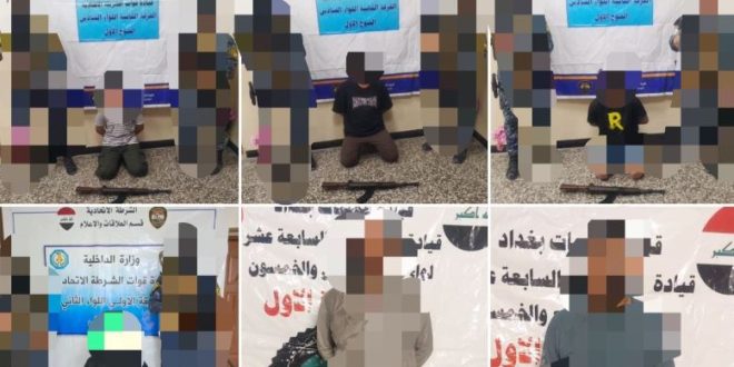 وأضاف البيان، أن “حصيلة ممارسات تطويق وتفتيش مناطق (أبو دشير، حي البتول، شهداء العبيدي، الأمين، جرف النداف، الحبيبية، كمب الأرمن، الشعلة، المواصلات، حي التراث، حي الفرات، المگيطيمات، شاخة١/المحمودية، عمشة_بستان حسيبة/ الطارمية)، يأتي ذلك من خلال تشكيلات فرقتي المشاة ( السادسة، السابعة عشرة، “والأولى والثانية والخامسة” شرطة اتحادية ولواء مغاوير القيادة وقيادتي شرطة بغداد الكرخ والرصافة بإسناد الأجهزة والوكالات الاستخبارية الملحقة بها، وبإشراف مباشر من القادة والآمرين، نتج عنها اعتقال (70) متهمًا وفق مواد قانونية مختلفة، بينهم مطلوبون بقضايا (السرقة، التهديد، حيازة السلاح غير المرخص) و(56) أجانب مخالفين لشروط وضوابط الإقامة والجنسية، وضبط أعداد من الأسلحة والأعتدة غير المرخصة” .