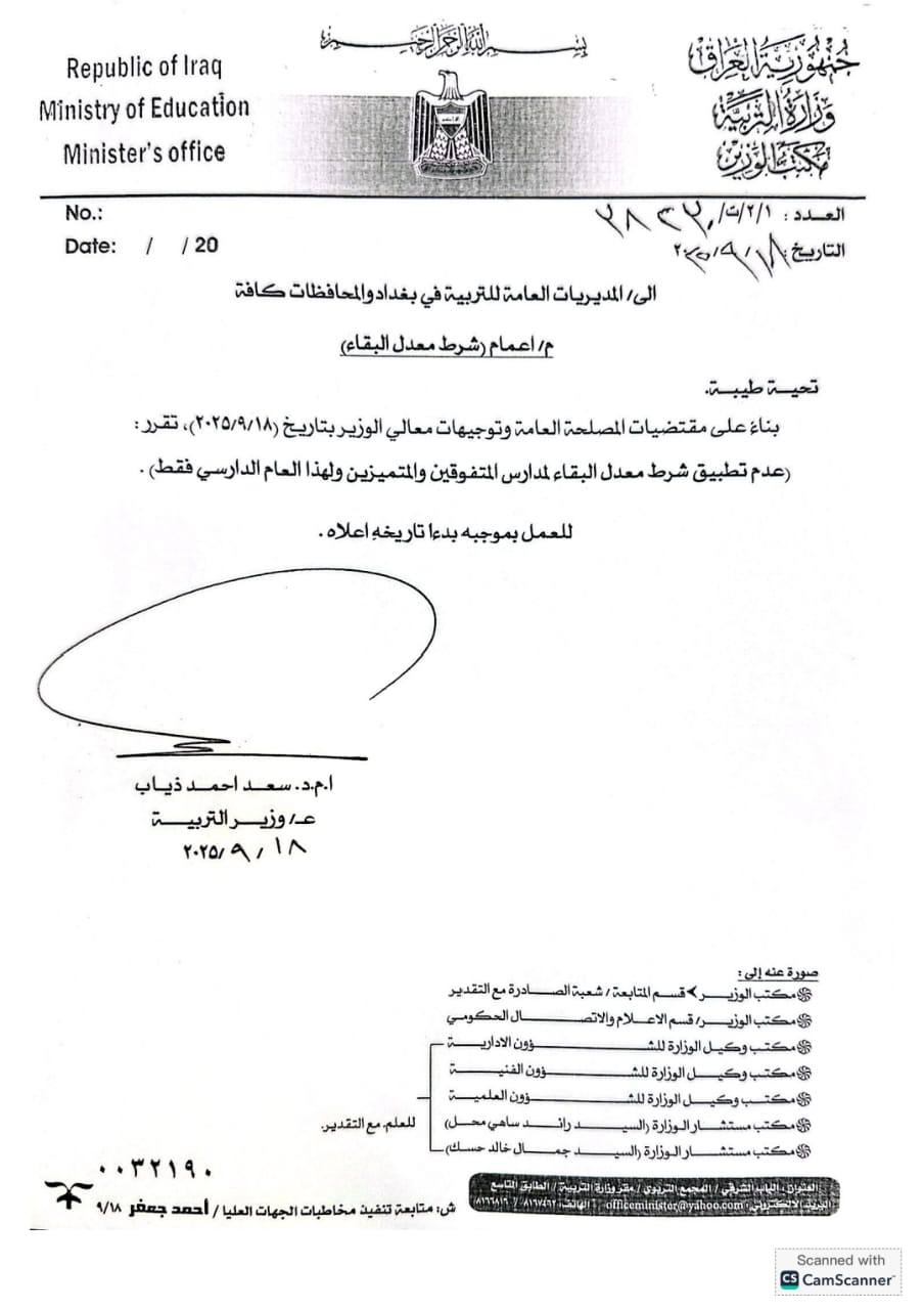 وأظهرت وثيقة رسمية تابعتها (الغدير) ،توجيه وزير التربية بإيقاف العمل بشرط معدل البقاء في مدارس المتفوقين والمتميزين لهذا العام الدراسي”.