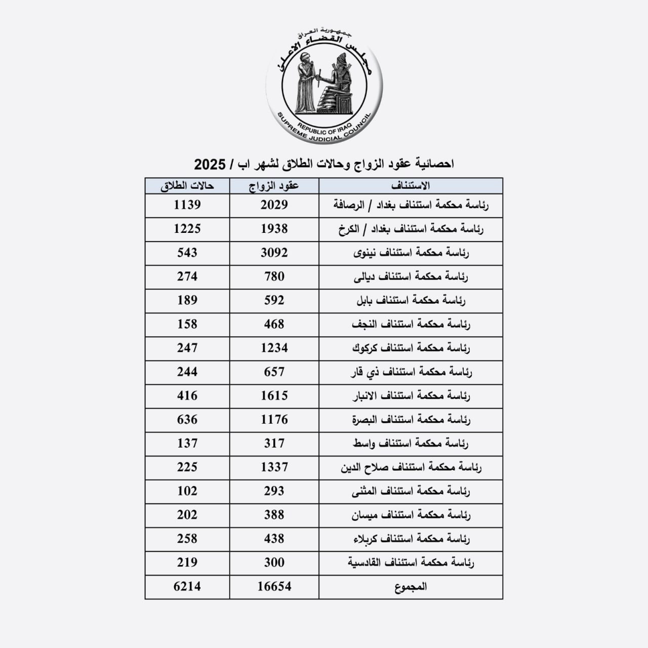 نشر مجلس القضاء الأعلى، اليوم الأحد، احصائية لعدد حالات الزواج والطلاق المسجلة لدى المحاكم المدنية في العراق، إذ سجل أكثر من 16 حالة زواج خلال الشهر آب الماضي فيما سجل شهر تموز الماضي 22 ألف حالة زواج.