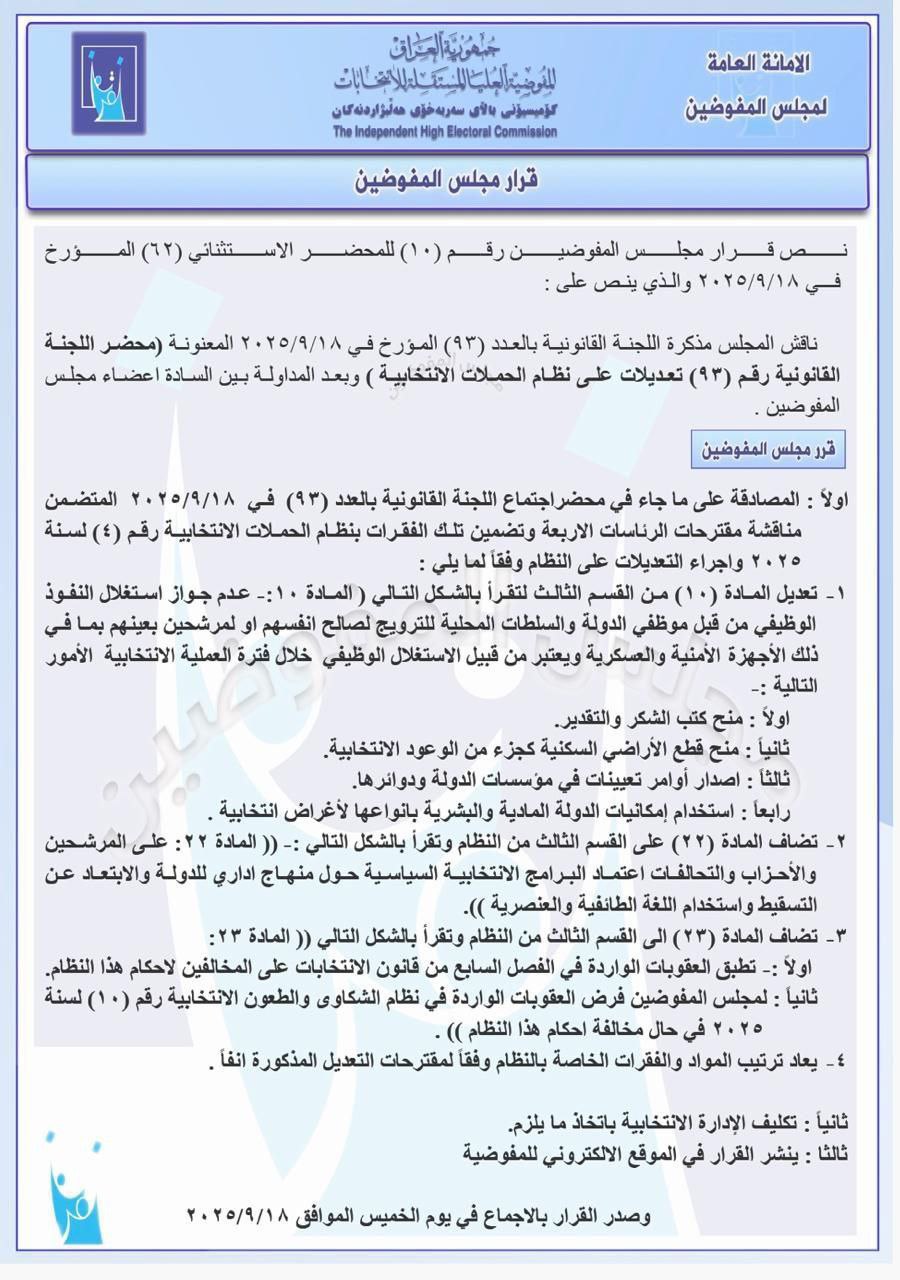 صادق مجلس المفوضين في المفوضية العليا المستقلة للانتخابات، على تعديلات في نظام الحملات الانتخابية، تهدف إلى منع استغلال النفوذ الوظيفي والتعيينات وقطع الأراضي بالحملات الانتخابية.