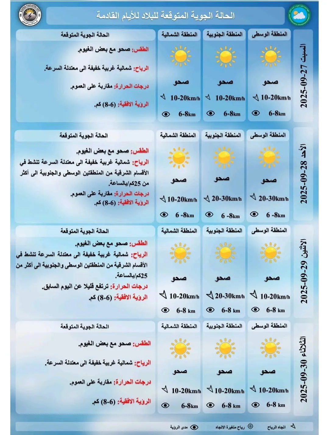 أعلنت هيئة الأنواء الجوية، اليوم الجمعة حالة طقس العراق خلال الأيام المقبلة. شاركها Facebook Twitter Pinterest