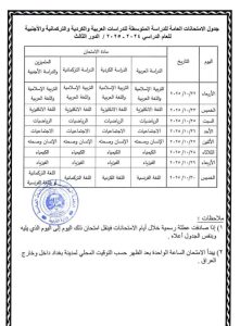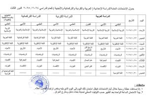 اعلنت وزارة التربية / اللجنة الدائمة للامتحانات العامة ،اليوم الثلاثاء، جدول الامتحانات الوزارية / الدور الثالث للعام الدراسي 2024-2025 للمراحل كافة ( الابتدائية والمتوسطة والإعدادية بفرعيها العلمي والأدبي ) للدراسات العربية والكردية والتركمانية .