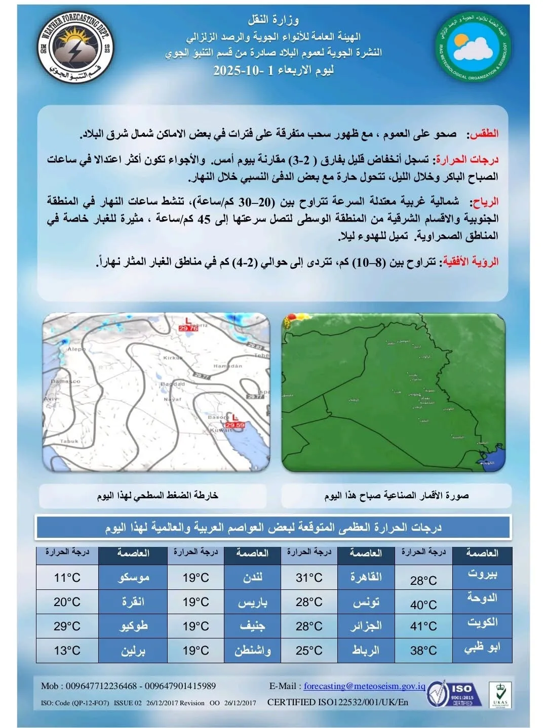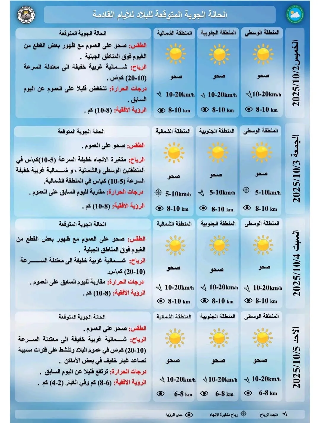 أعلنت هيئة الأنواء الجوية، اليوم الأربعاء، حالة طقس العراق خلال الأيام المقبلة.