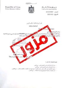 وذكر المكتب الإعلامي لرئاسة الوزراء في بيان تلقته (الغدير) أن “الكتاب المنسوب إلى مكتب رئيس مجلس الوزراء والموجه بصرف هذا المبلغ مزور ولا أساس له من الصحة، وقد تم نفيه رسميًا من الجهات المختصة” .