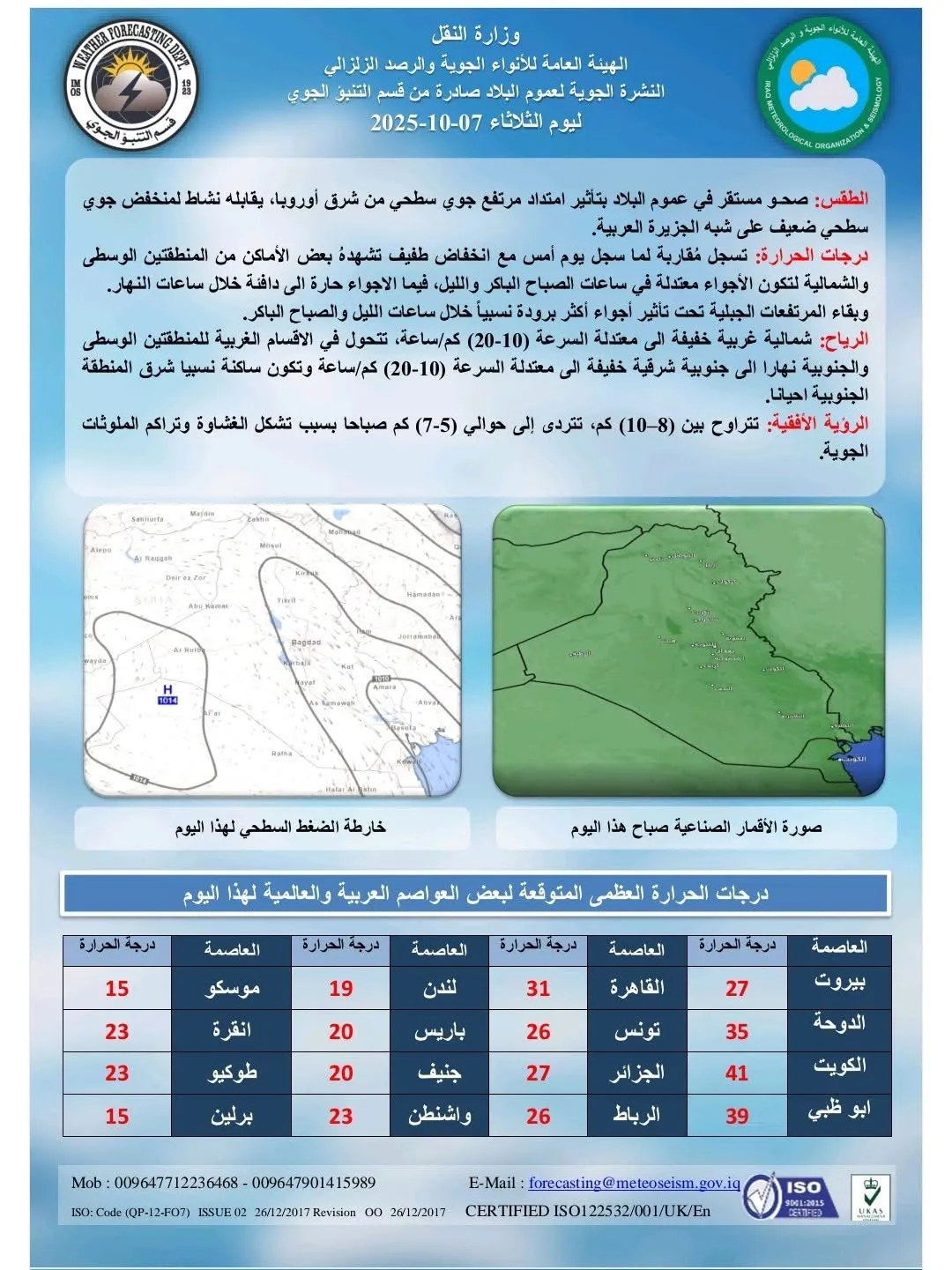 تشير توقعات الطقس، اليوم الثلاثاء ، الى استمرار حالة الاستقرار الجوي في عموم البلاد، مع ارتفاع طفيف في درجات الحرارة خلال الساعات المقبلة متأثرة بامتداد مرتفع جوي سطحي لتكون الأجواء معتدلة في ساعات الصباح الباكر والليل، فيما تكون حارة الى دافئة خلال ساعات النهار.