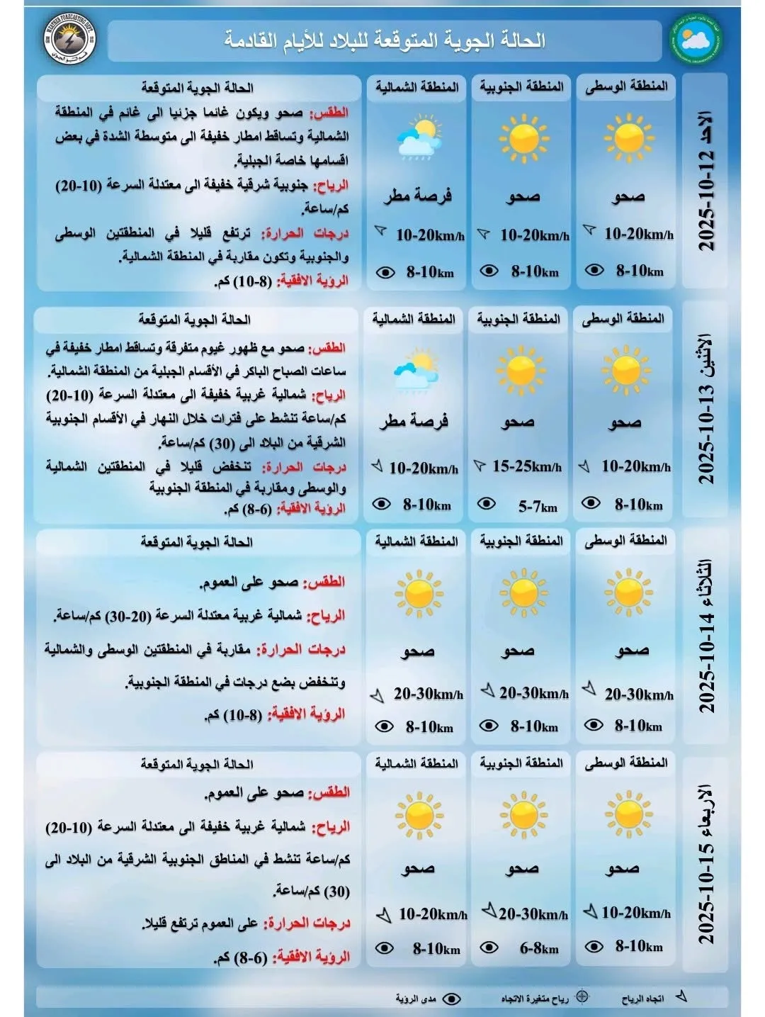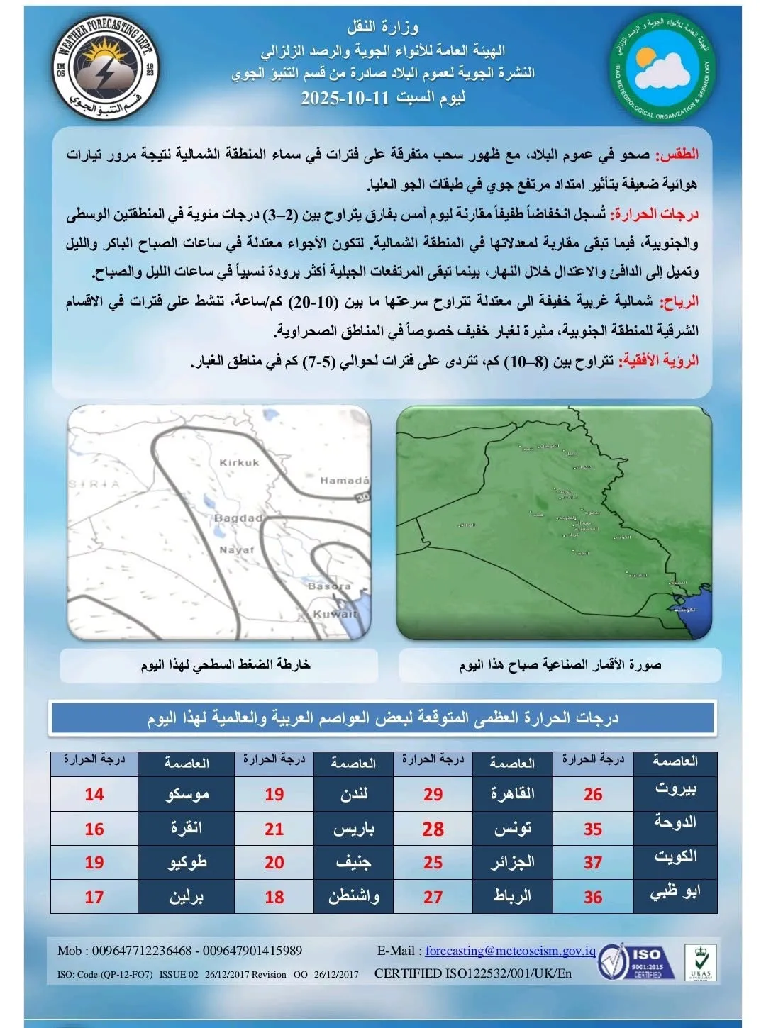 توقعت هيئة الأنواء الجوية، بأن يشهد طقس العراق أمطاراً وحرارة منخفضة هذا الأسبوع.