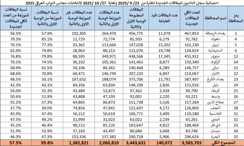 وبحسب وثيقة حصلت عليها “بغداد اليوم”، اليوم الاثنين (27 تشرين الأول 2025)، فإن “أكثر من 1.4 مليون بطاقة ما زالت غير موزعة وغير مطبوعة، وهو ما يعكس حجم التحديات اللوجستية التي تواجه عملية توزيع البطاقات الانتخابية”.