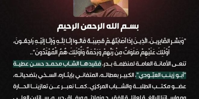 نعت الأمانة العامة لمنظمة بدر فقيدها الشاب محمد حسن عطية، المعروف بـ “أبو زينب العبّودي”، عضو مكتب الطلبة والشباب المركزي، الكبير بعطائه والمتفاني في خدمة الآخرين والسخي بتضحياته.