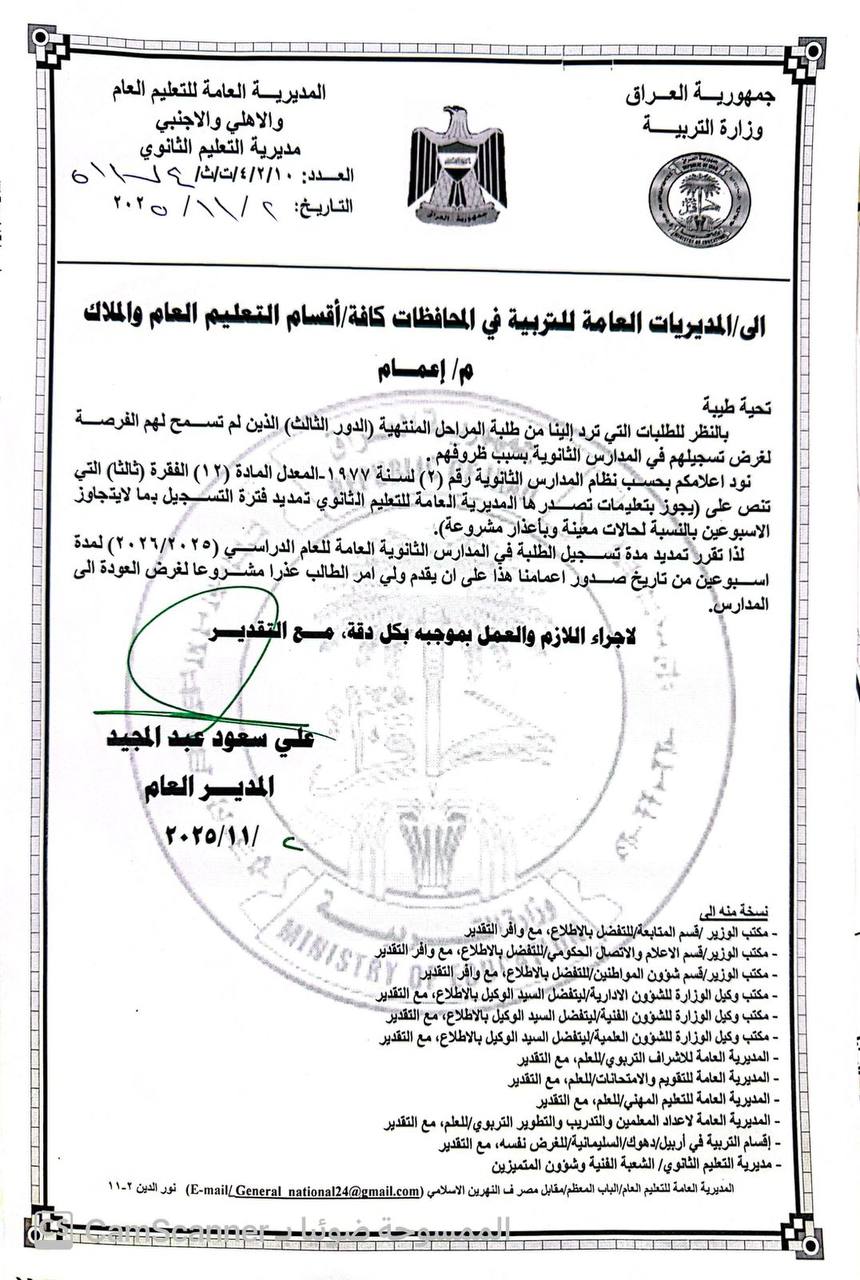 وذكرت الوزارة في بيان تلقت(الغدير) نسخة منه، ان ” المديرية العامة للتعليم العام والأهلي والأجنبي قررت تمديد مدة تسجيل الطلبة في المدارس الثانوية العامة للعام الدراسي (2026/2025) لأسبوعين من تاريخ صدور الكتاب أدناه”.