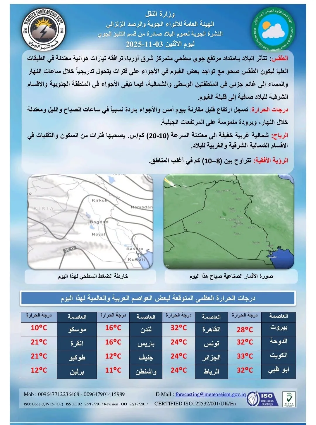العراق يتأثر بمرتفع جوي أوروبي ترافقه تيارات هوائية