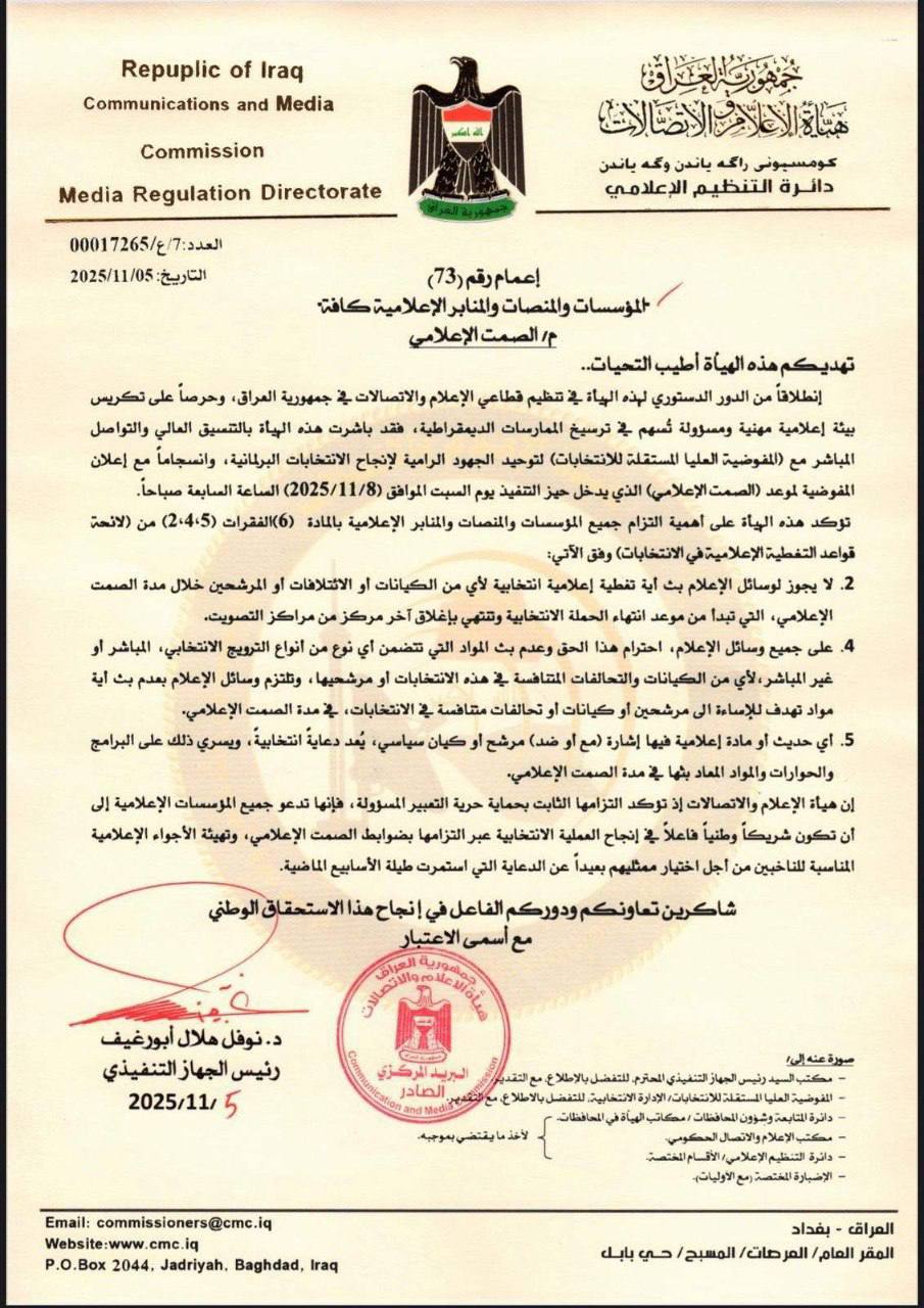 وذكرت الهيئة في بيان، تلقته (الغدير) ، أنها “باشرت بالتنسيق المباشر مع المفوضية العليا المستقلة للانتخابات، لتوحيد الجهود الرامية لإنجاح الانتخابات البرلمانية، وانسجاماً مع إعلان، المفوضية لموعد (الصمت الانتخابي) الذي يدخل حيز التنفيذ يوم السبت الموافق (8/11/2025) الساعة السابعة صباحاً”.