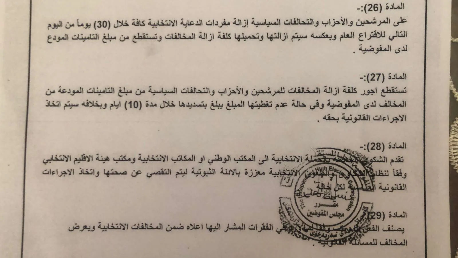 وأضافت الوثيقة أن “المفوضية تستطيع استقطاع أجور إزالة المخالفات للمرشحين والأحزاب من التأمينات خلال مدة أقصاها عشرة أيام، وفي حال عدم تغطية المبلغ المطلوب، سيُتخذ بحق المخالفين الإجراء القانوني المناسب”.