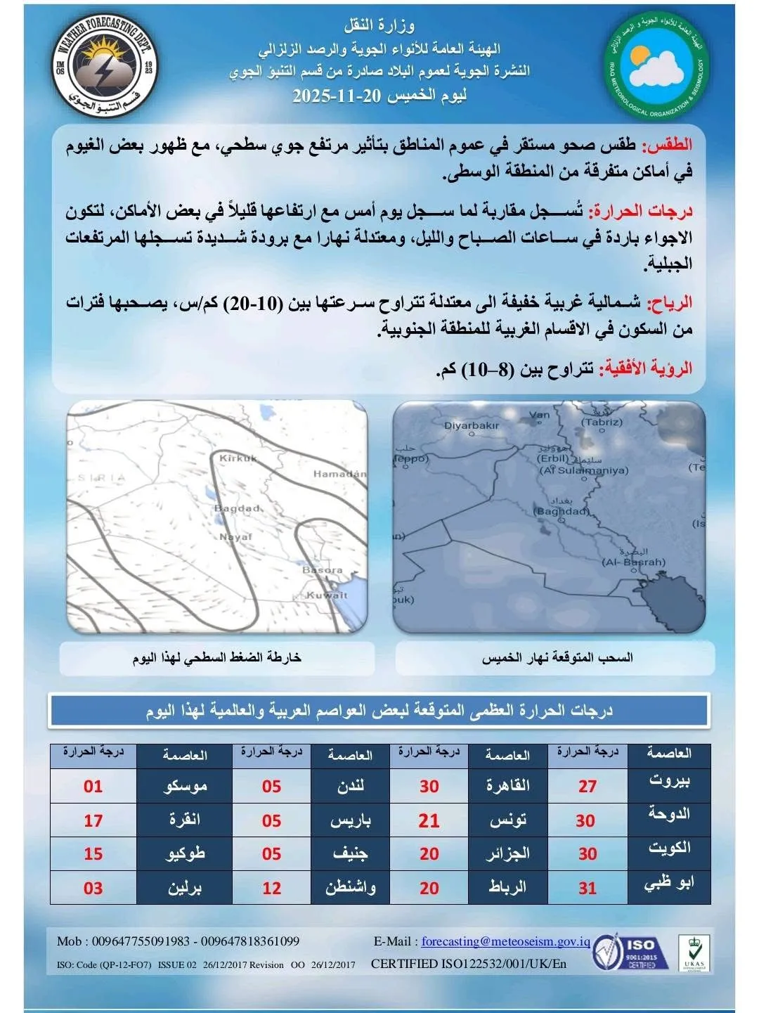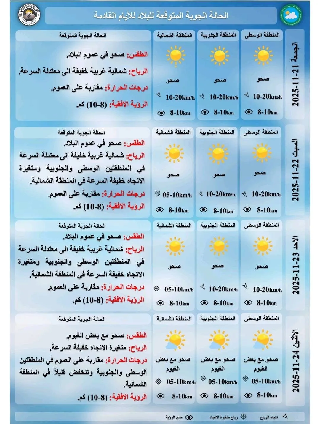 أعلنت هيئة الأنواء الجوية، اليوم الخميس، عن تفاصيل حالة الطقس في البلاد للأيام المقبلة، فيما توقعت انخفاضاً في درجات الحرارة الأسبوع القادم. شاركها Facebook Twitter Pinterest