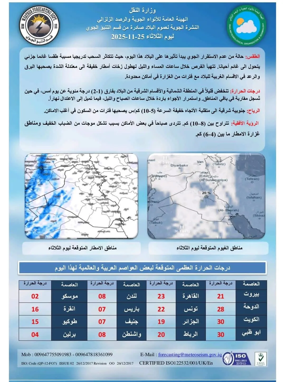 عدم استقرار جوي في العراق يبدأ بغيوم ويتحول إلى أمطار