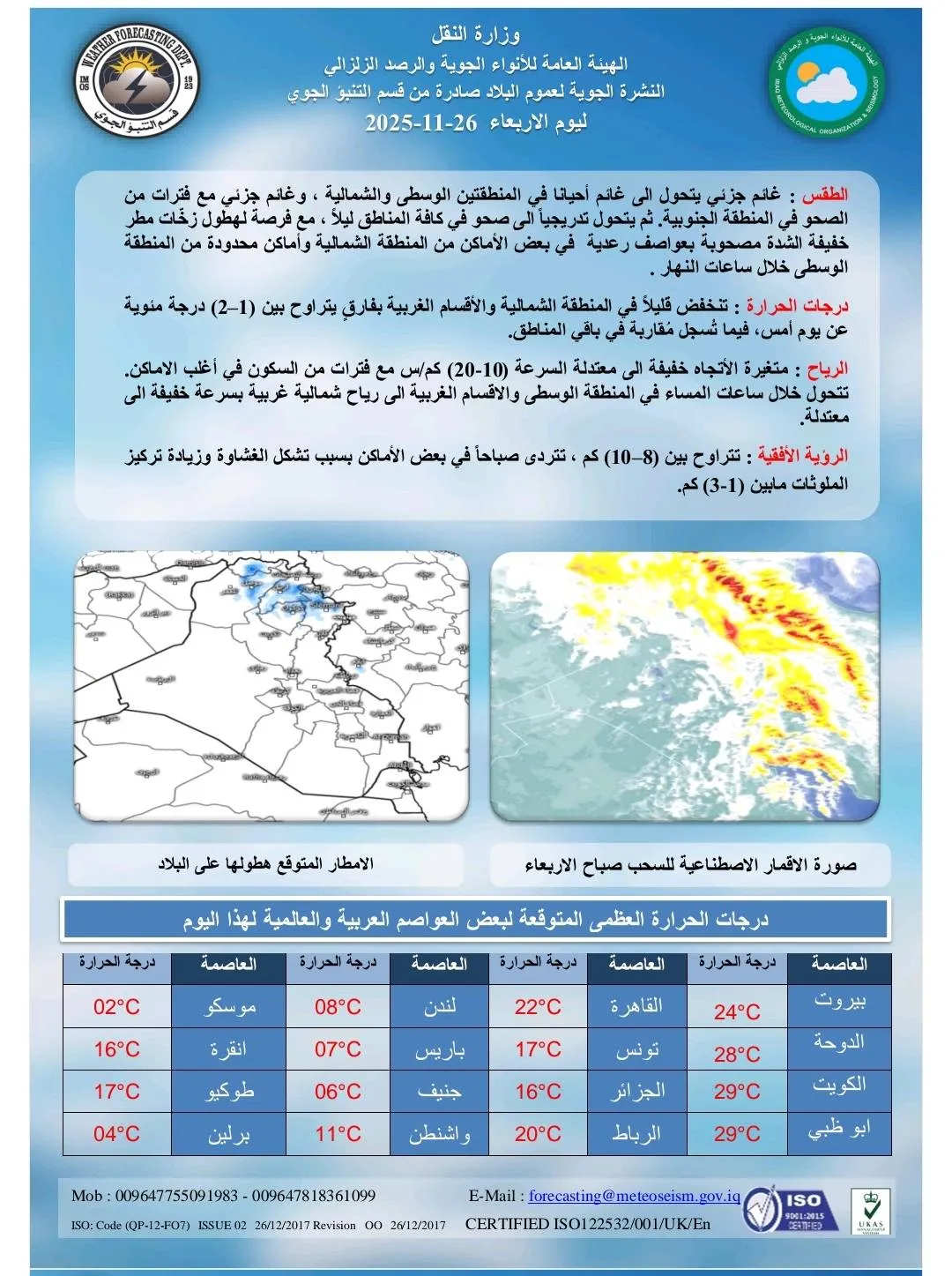 أعلنت هيئة الأنواء الجوية، اليوم الأربعاء، حالة طقس العراق خلال الأيام المقبلة، فيما أشارت إلى أن الطقس صحو تحجبه غشاوة التلوث.