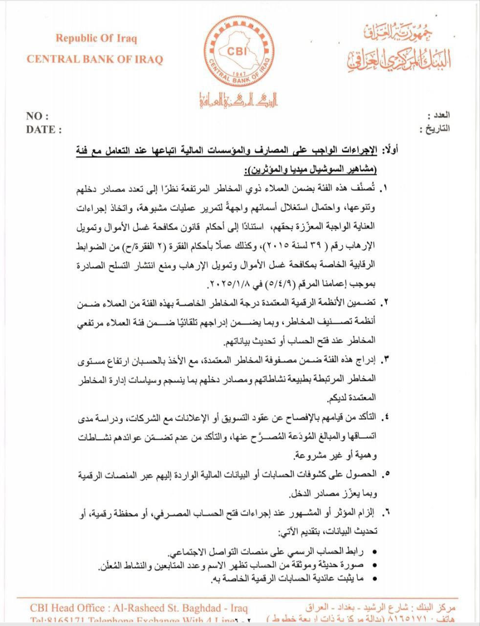 عمّم البنك المركزي العراقي تحذيراً على البنوك والمصارف، موجهاً إياها بتصنيف مشاهير السوشيال ميديا والمؤثرين ضمن فئة “العملاء ذوي المخاطر المرتفعة والمتعددة”.
