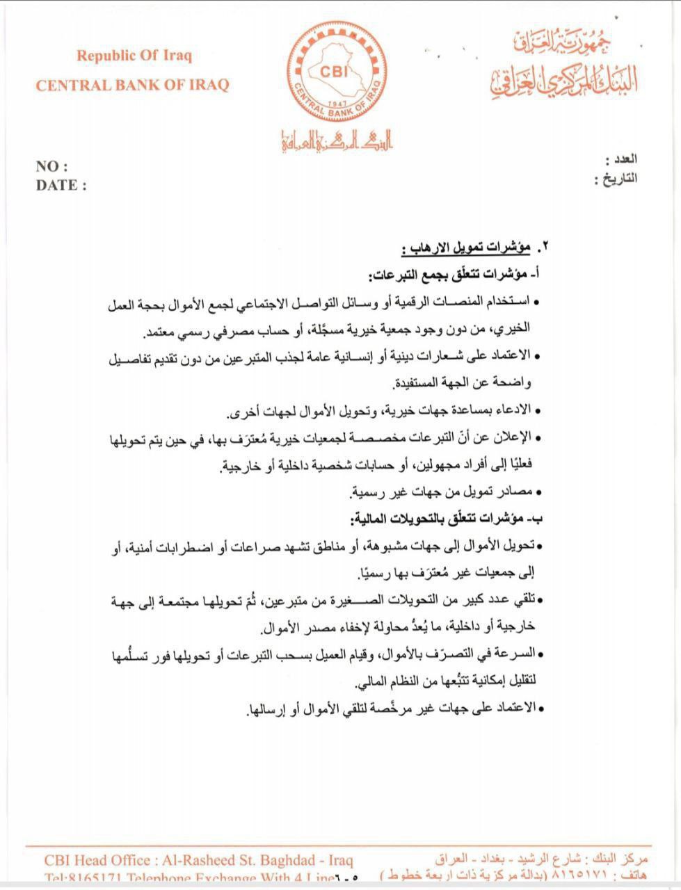 ووجّه البنك المركزي بحزمة تعليمات تهدف إلى حماية القطاع المصرفي العراقي من أي استغلال محتمل.