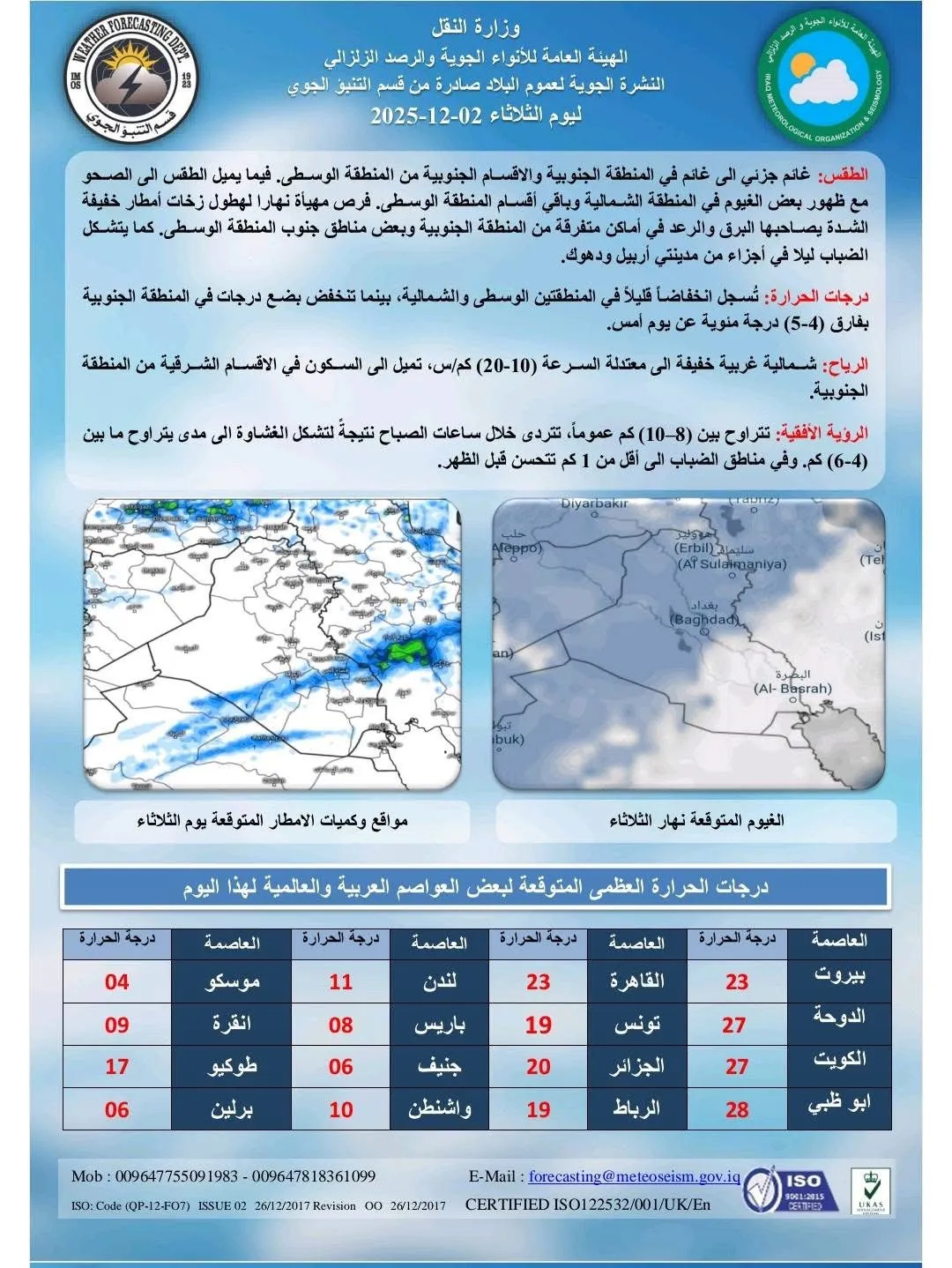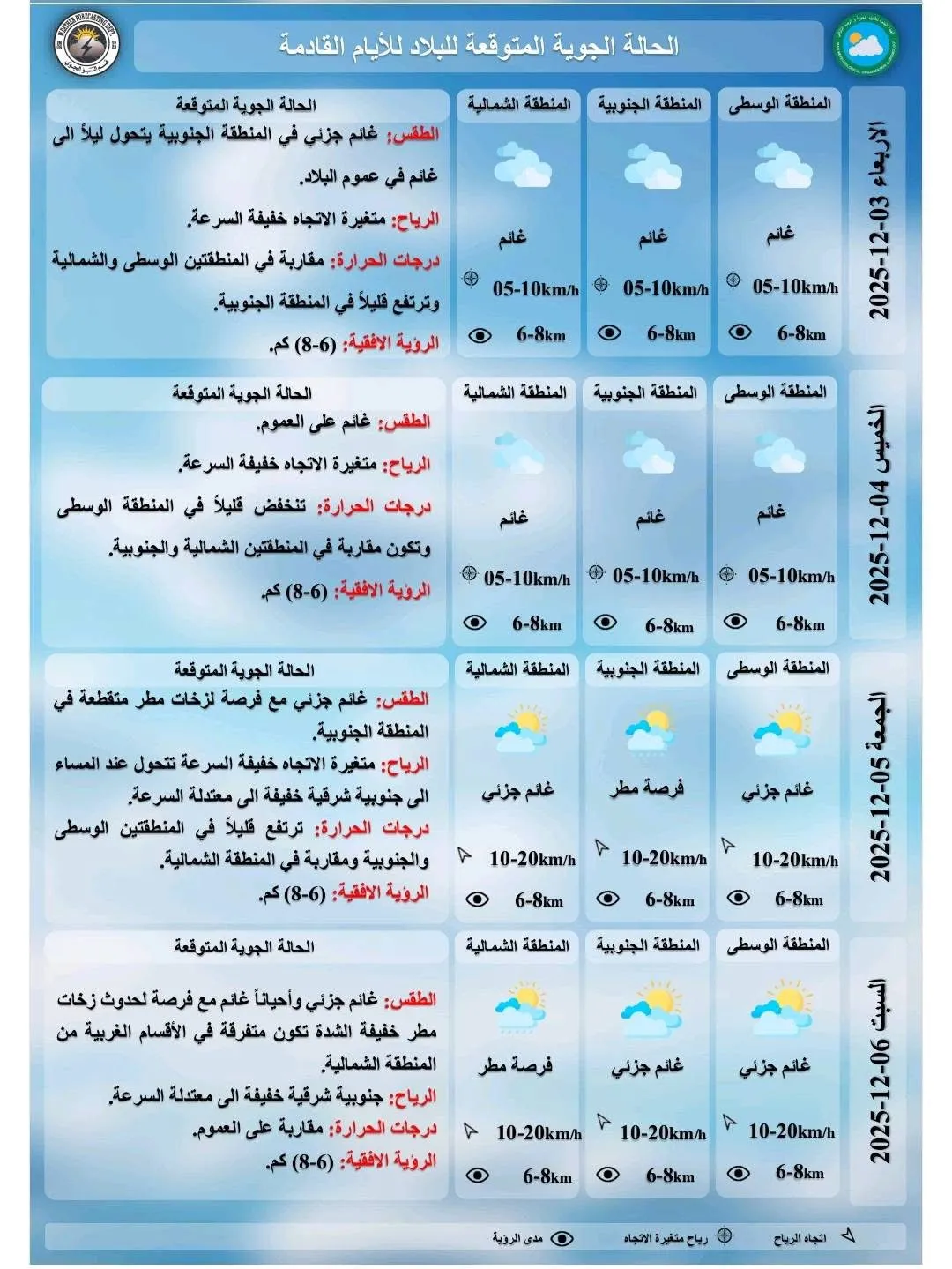 طقس العراق.. تراجع بدرجات الحرارة وزخات مطر وتشكل الضباب ليلاً