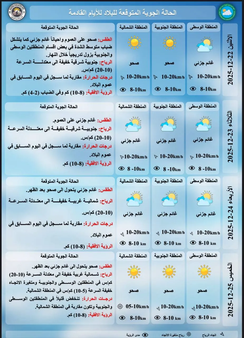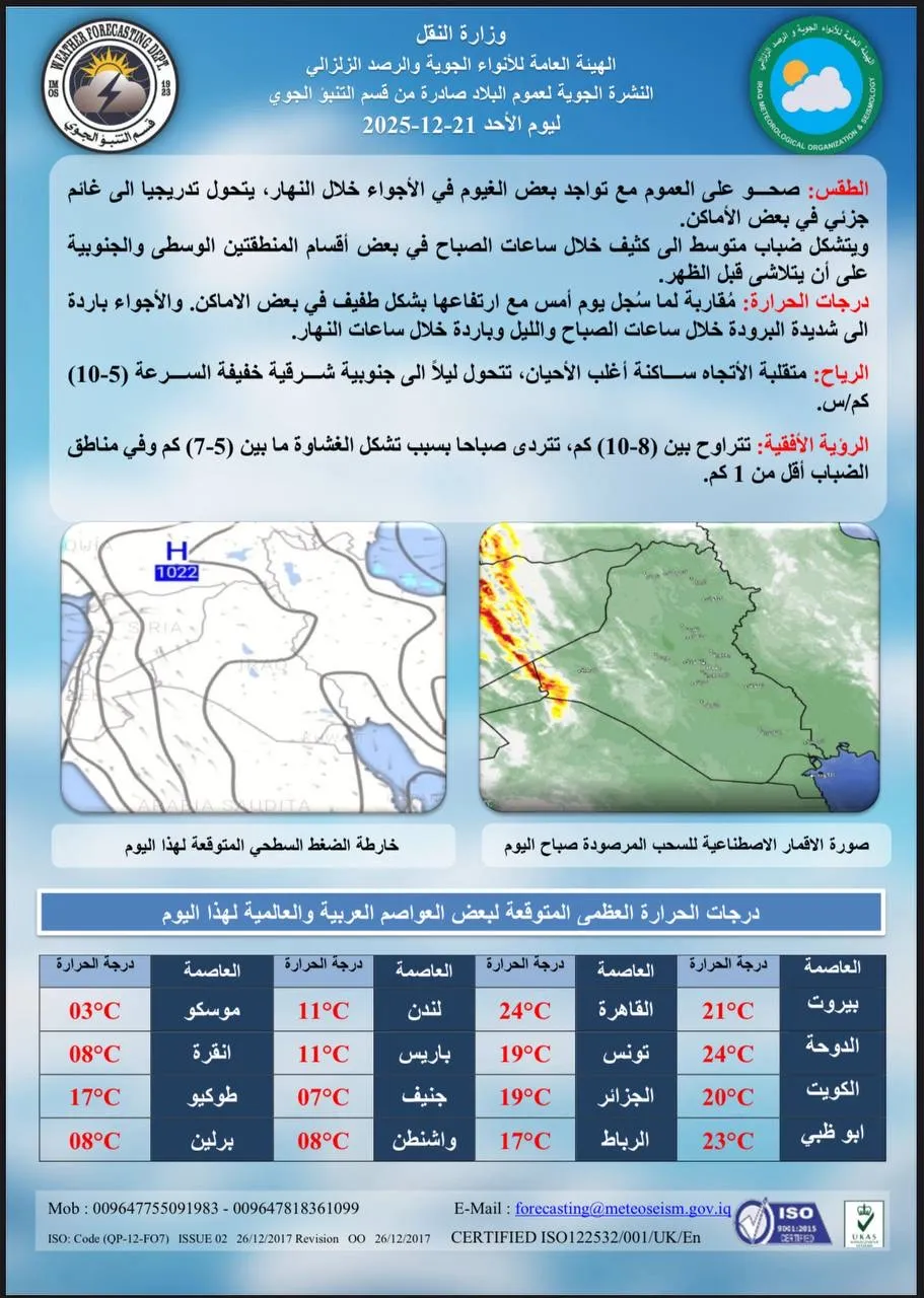توقعت هيئة الأنواء الجوية، بأن يكون طقس العراق بلا أمطار مع أجواء صحوة وغائمة جزئياً مع ضباب.