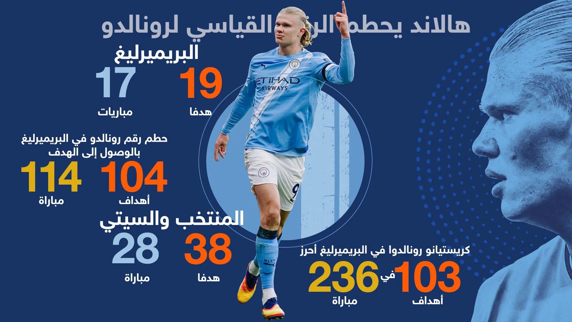 واصل القناص النرويجي إرلينغ هالاند تحطيم الأرقام القياسية مع مانشستر سيتي بمعدل تهديفي مرعب يتجاوز الهدف في كل مباراة، حيث نجح أمس السبت في تجاوز الأسطورة البرتغالي كريستانو رونالدو في قائمة الهدافين التاريخيين للدوري الإنجليزي الممتاز.