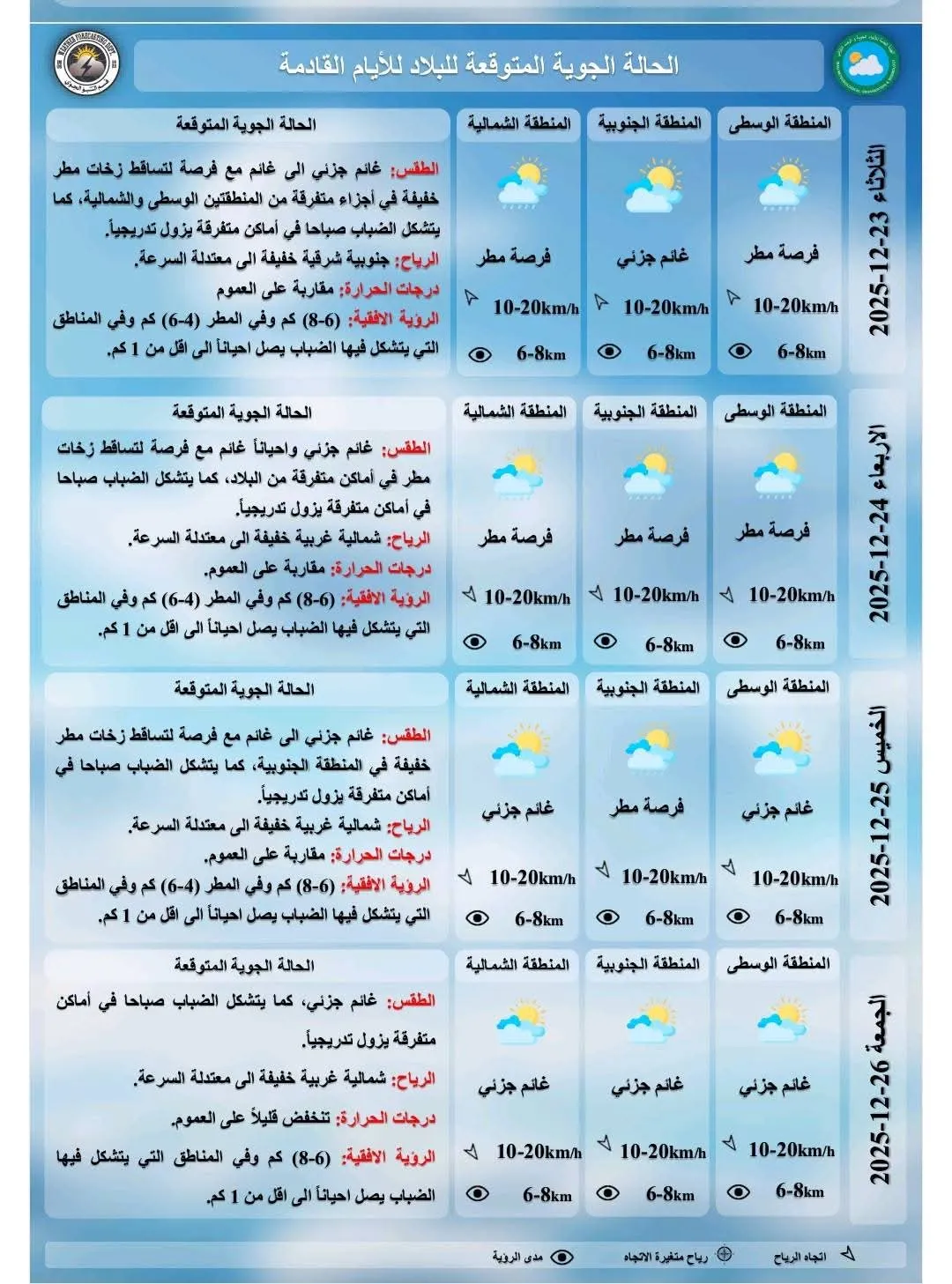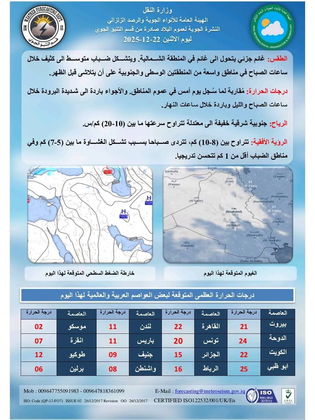 أعلنت هيئة الأنواء الجوية اليوم الإثنين حالة طقس العراق خلال الأيام المقبلة.
