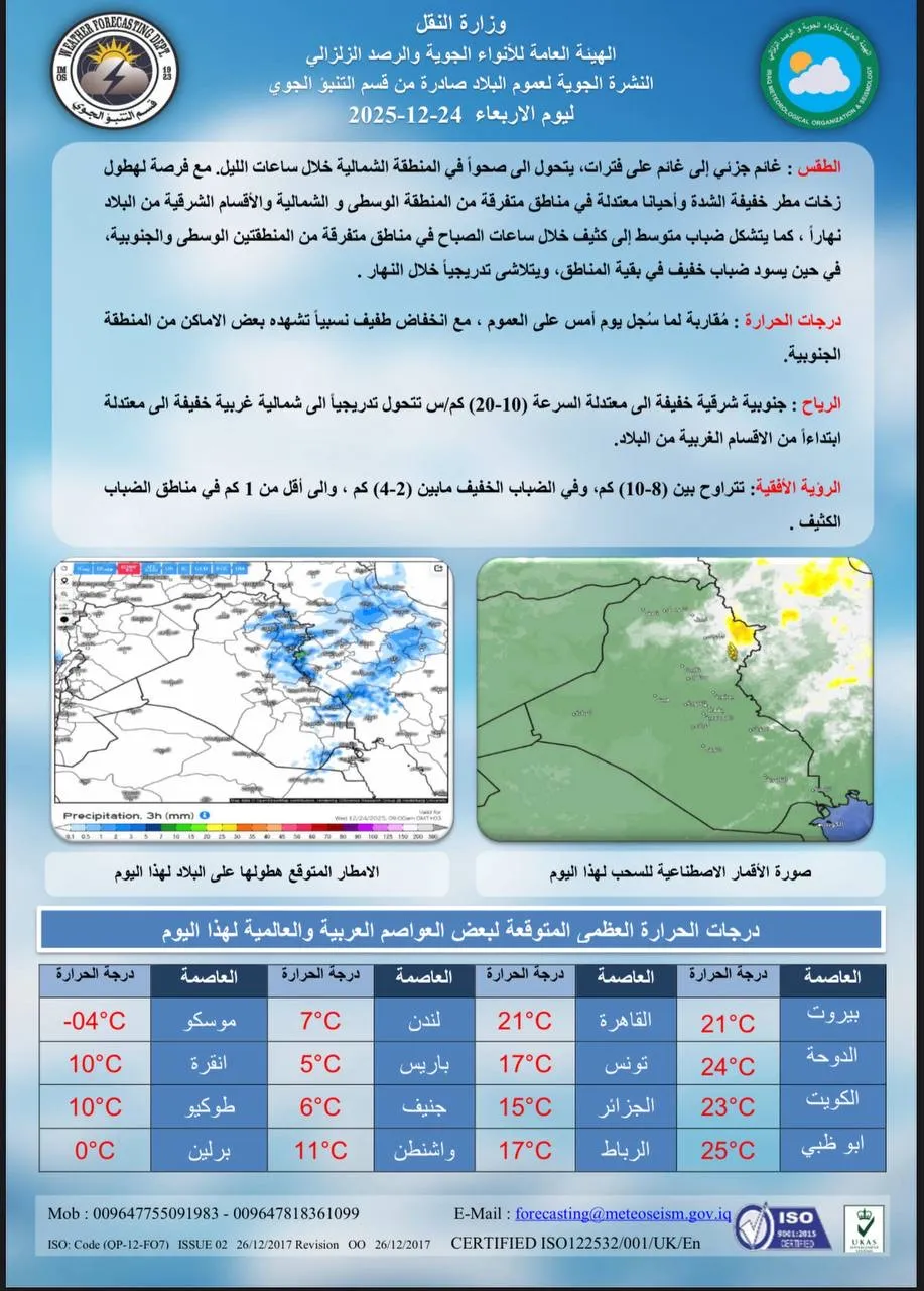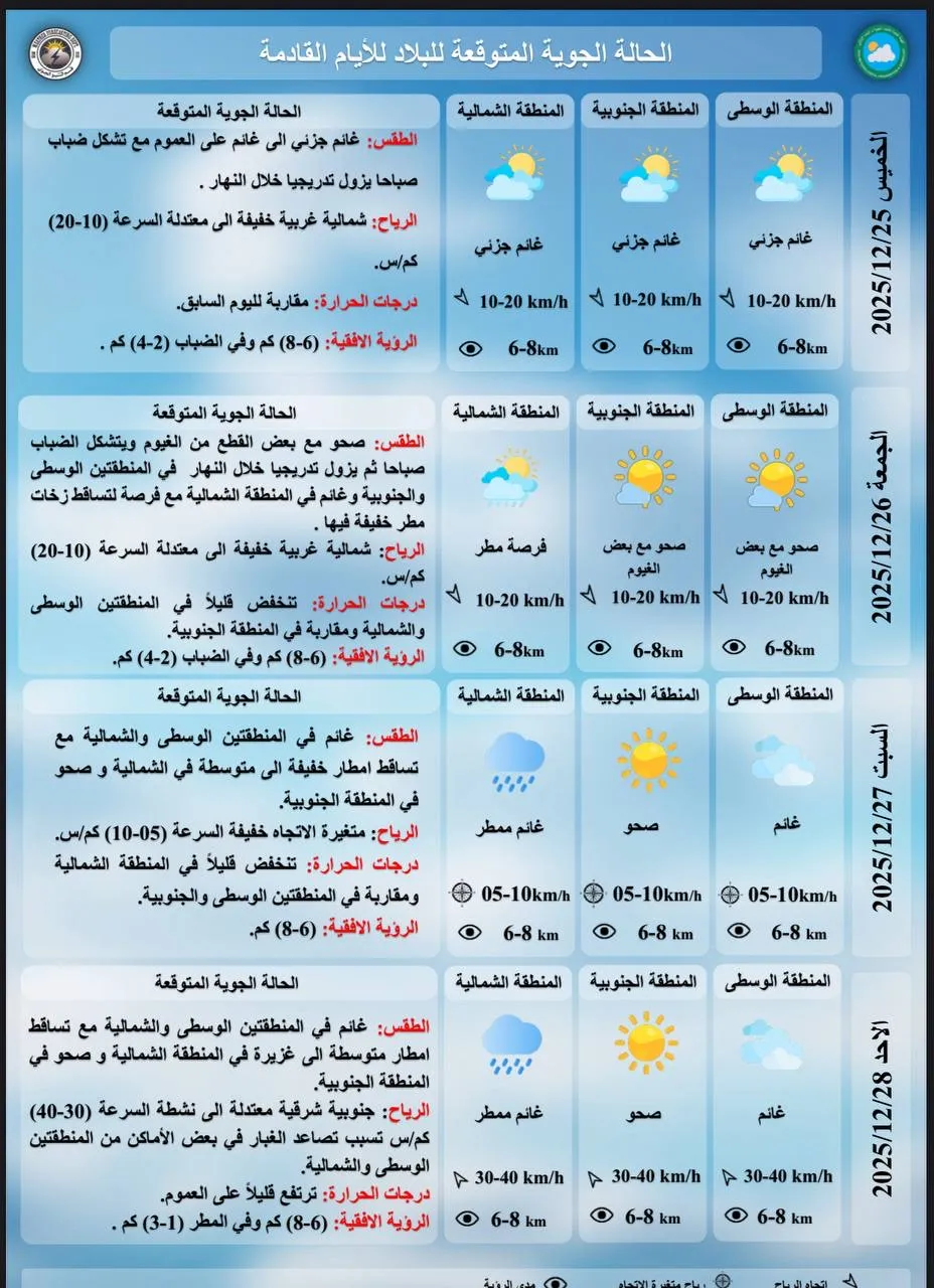 طقس العراق.. غيوم ممطرة ضباب وانخفاض ملحوظ في درجات الحرارة