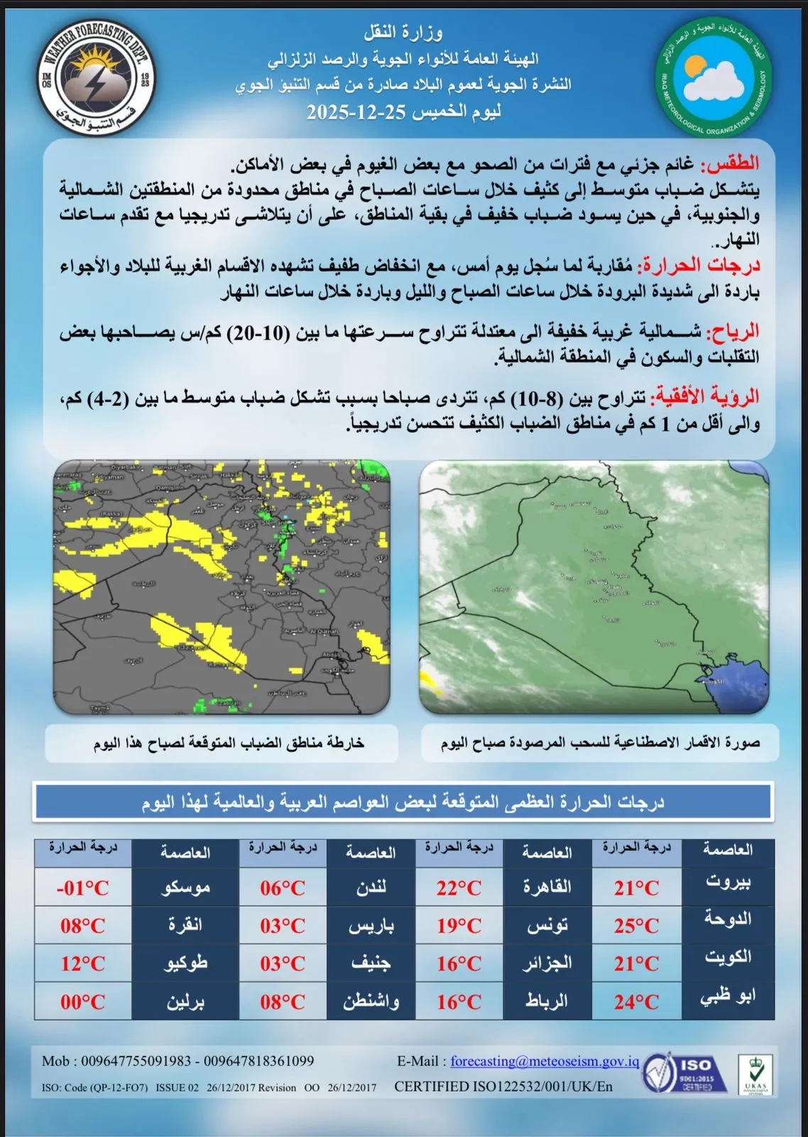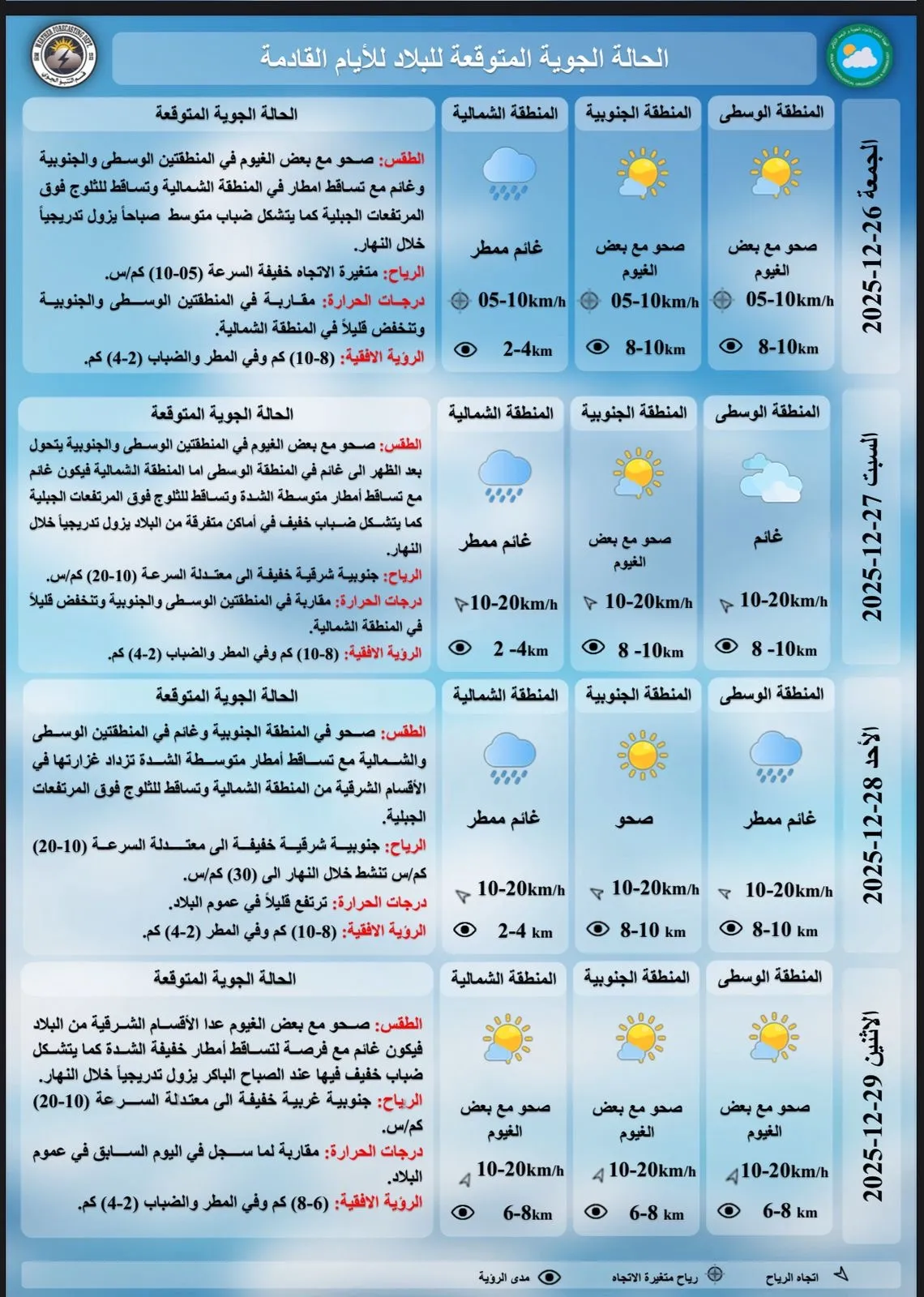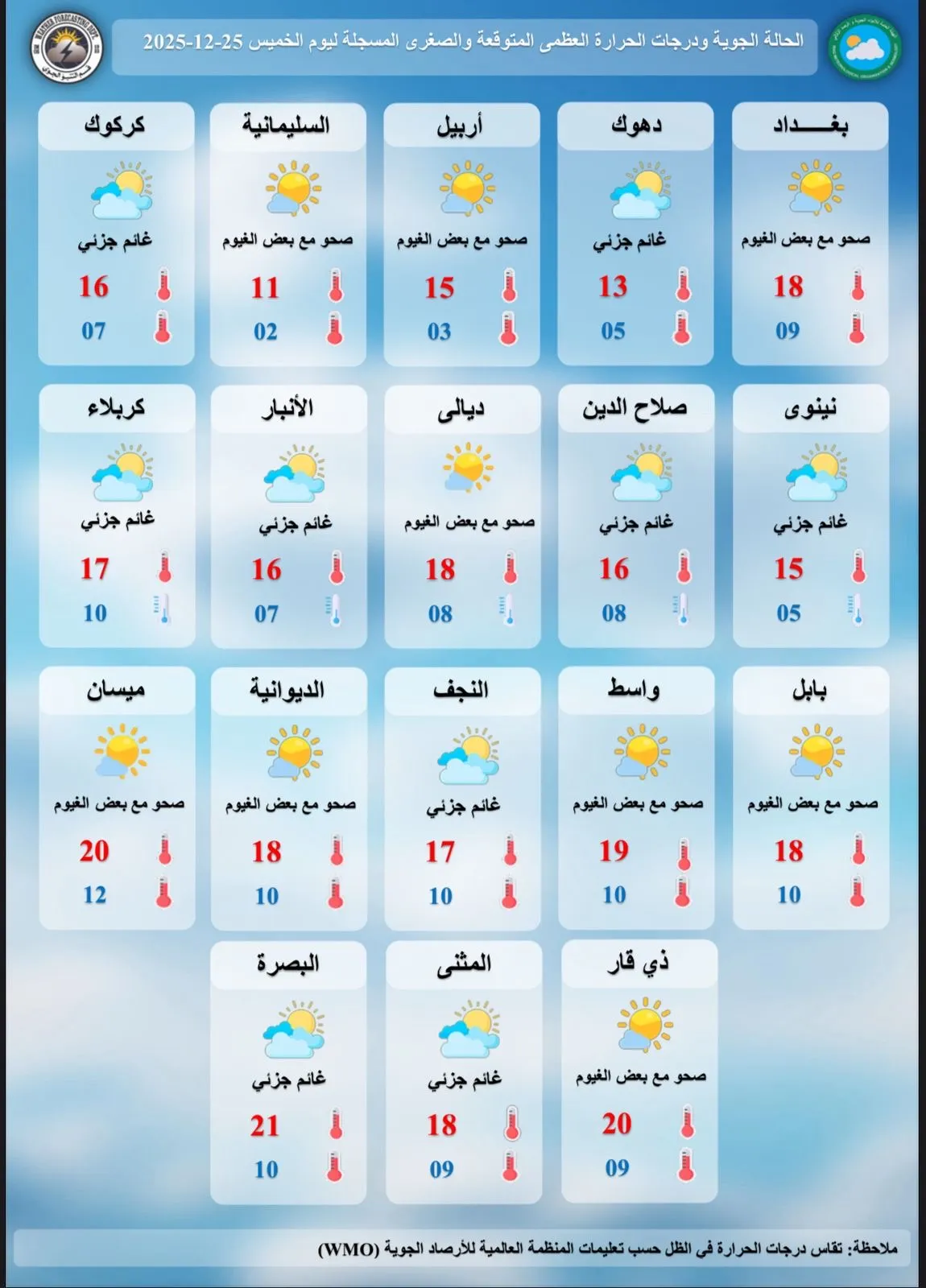 توقعت هيئة الأنواء الجوية، طقس العراق لليوم الخميس والأيام المقبلة. شاركها Facebook Twitter Pinterest