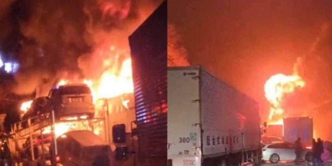 شب حريق ضخم في اليابان السبت بعد حادث مروري مروع شهد اصطدام أكثر من 50 سيارة مع شاحنة نقل مركبات ، على أحد الطرق السريعة في البلاد.