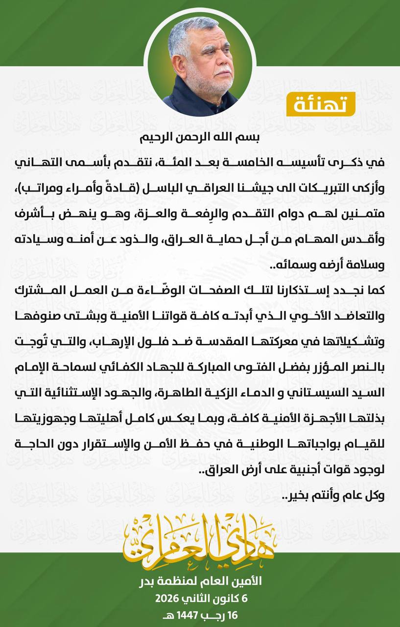 وقال السيد العامري اليوم الثلاثاء،في ذكرى التأسيس الخامسة بعد المئة للجيش العراقي، نتقدم بأسمى التهاني وأزكى التبريكات الى جيشنا العراقي الباسل (قادةً وأمراء ومراتب)، متمنين لهم دوام التقدم والرِفعة والعزة، وهو ينهض بأشرف وأقدس المهام من أجل حماية العراق، والذود عن أمنه وسيادته وسلامة أرضه وسمائه.