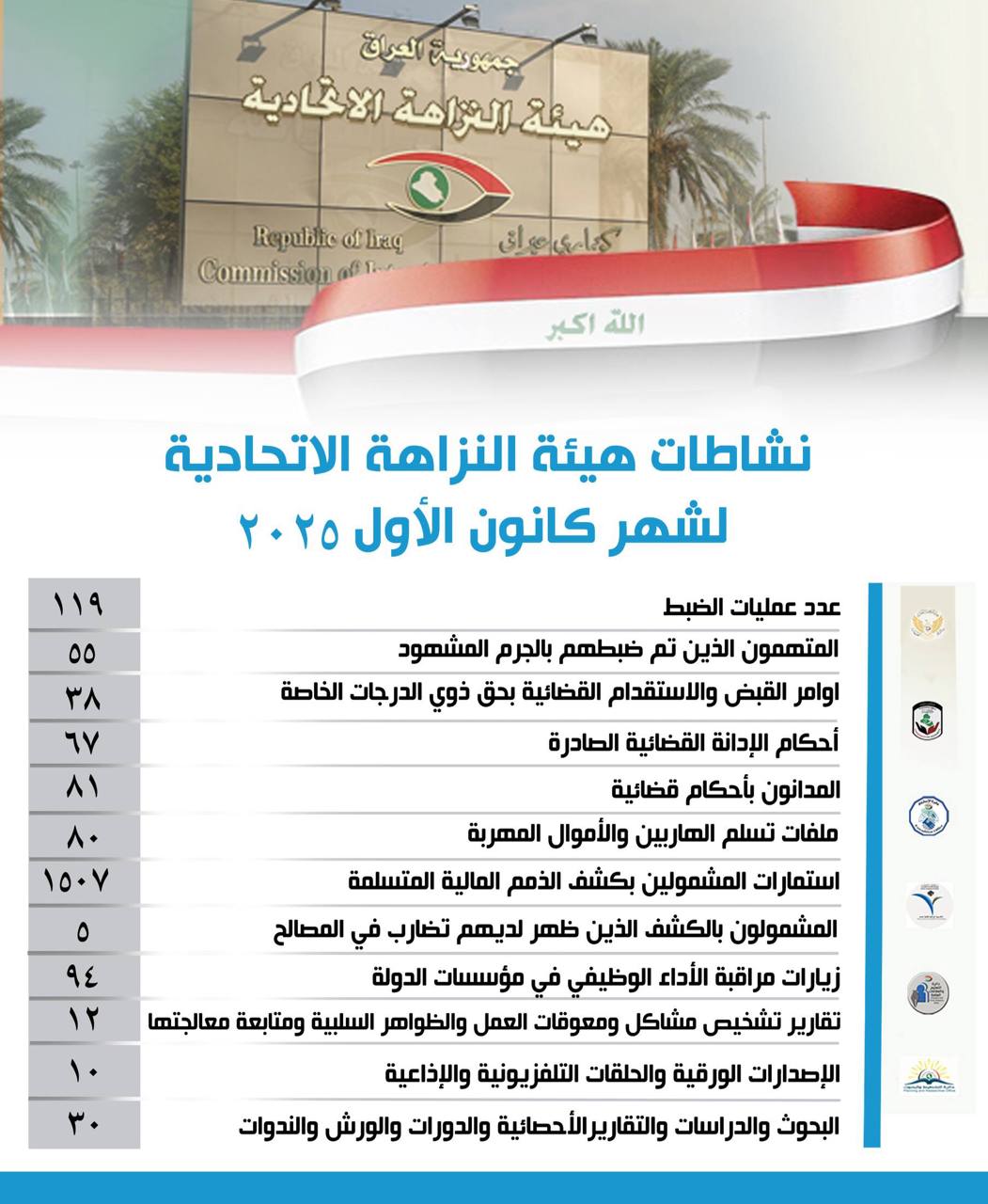 أعلنت هيئة النزاهة الاتحادية اليوم الخميس، حصيلة نشاطاتها لشهر كانون الأول 2025، كاشفة عن تنفيذ عشرات عمليات الضبط وإصدار أوامر قبض واحكام قضائية بحق متهمين بالفساد، الى جانب توسيع زياراتها الرقابية ومتابعة ملفات الهاربين والأموال المهرّبة.