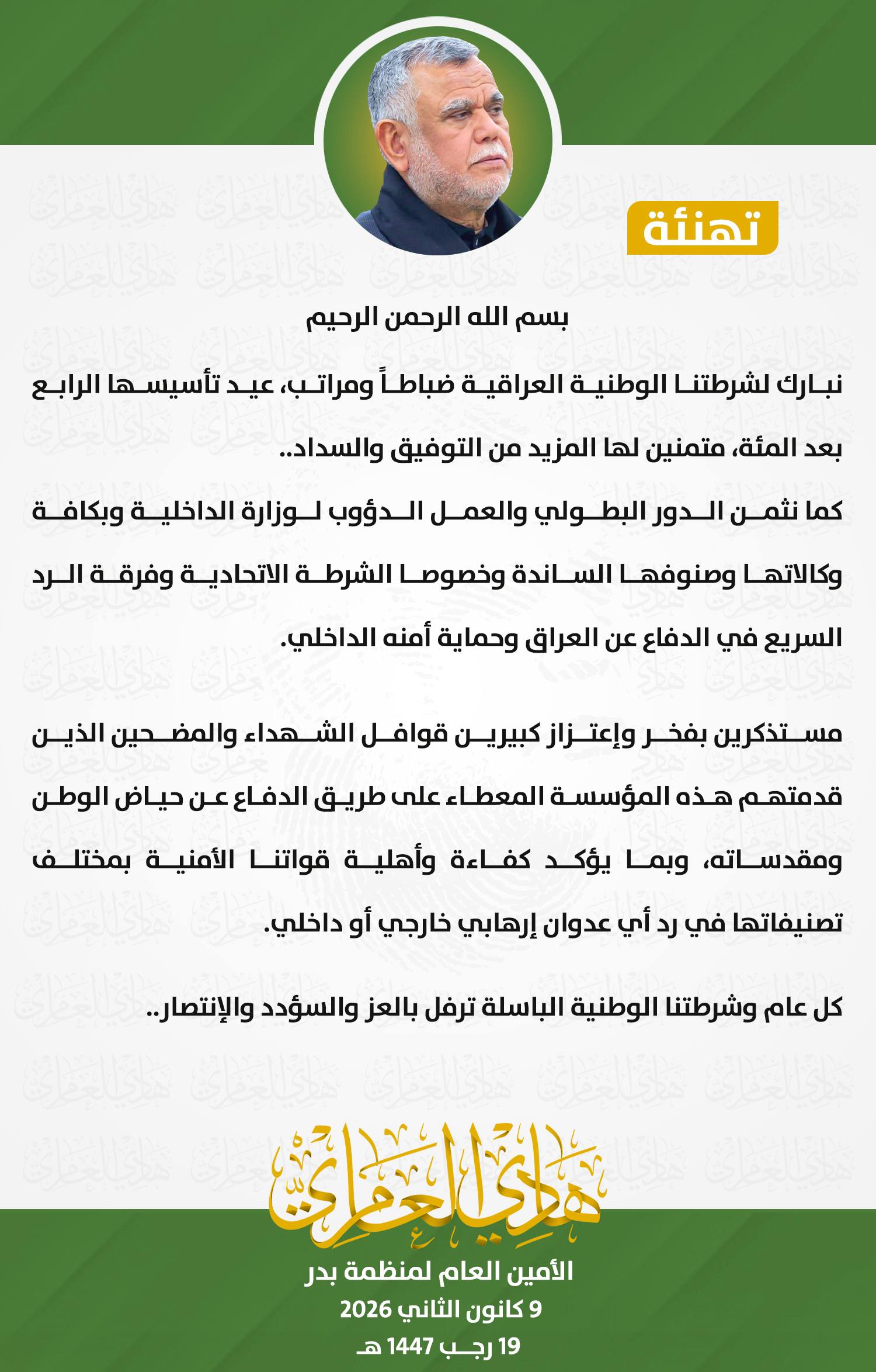 بمناسبة الذكرى الـ104 لتأسيس الشرطة الوطنية العراقية، قدّم الأمين العام لمنظمة بدر، اليوم الجمعة ، السيد هادي العامري، تهانيه الحارة إلى منتسبي الشرطة من ضباط ومراتب، متمنيًا لهم دوام التوفيق والسداد في أداء مهامهم الوطنية.