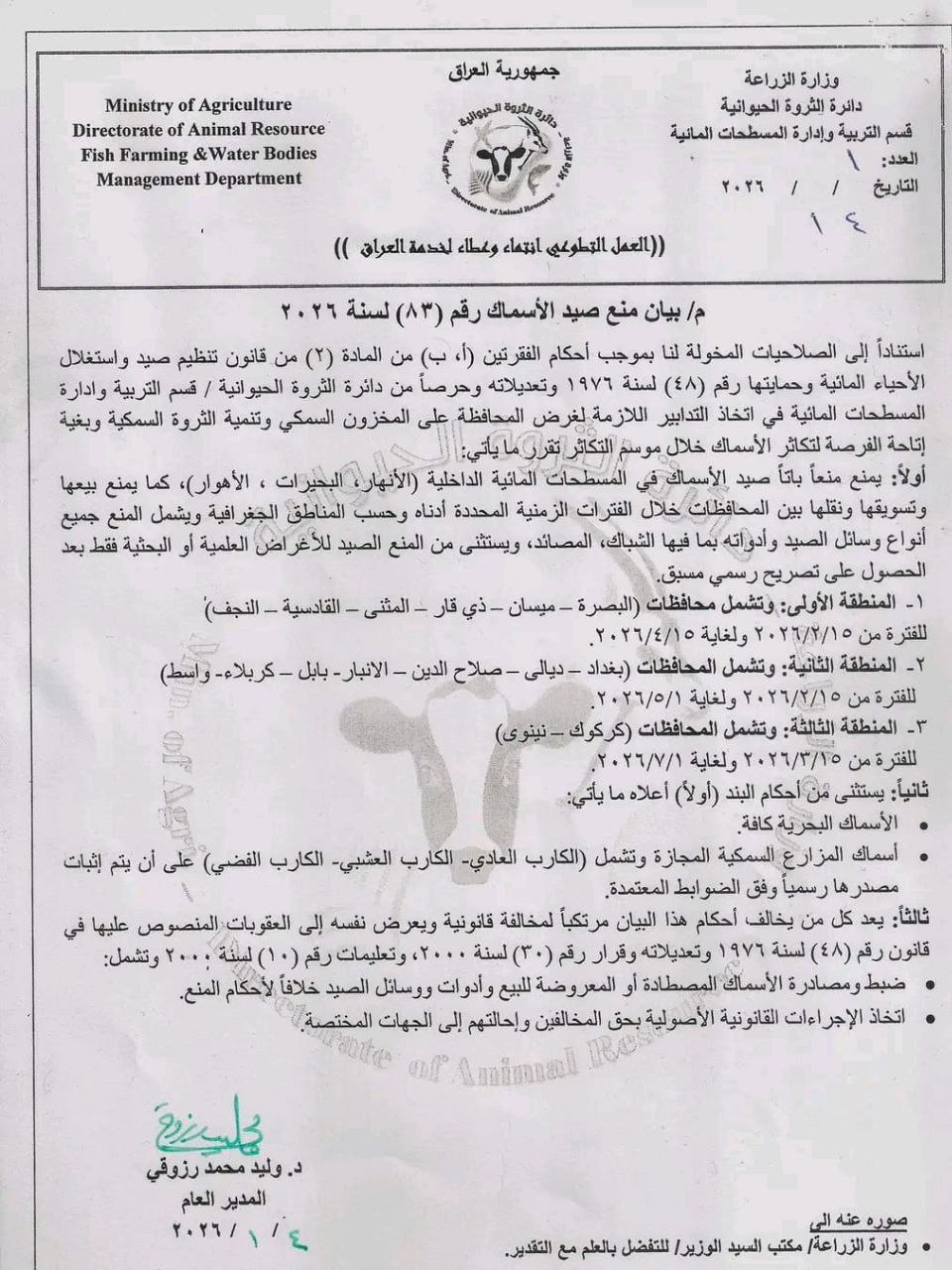 وذكرت الدائرة في وثيقة حصلت عليها ( الغدير) أن “هذا الإجراء يُعد مسؤولية وطنية تهدف إلى دعم الأمن الغذائي والمحافظة على التوازن البيئي”.