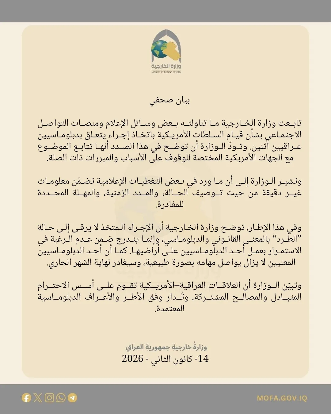 وجاء في بيان للوزارة ، “تابعت وزارة الخارجية ما تناولته بعض وسائل الإعلام ومنصات التواصل الاجتماعي بشأن قيام السلطات الأمريكية باتخاذ إجراء يتعلق بدبلوماسيين عراقيين اثنين وأضاف البيان “تودّ الوزارة أن توضح في هذا الصدد أنها تتابع الموضوع مع الجهات الأمريكية المختصة للوقوف على الأسباب والمبررات ذات الصلة”، مشيرة إلى أن “ما ورد في بعض التغطيات الإعلامية تضمّن معلومات غير دقيقة من حيث توصيف الحالة، والمدد الزمنية، والمهلة المحددة للمغادرة”.