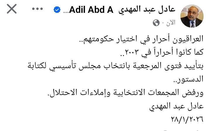 وقال عبد المهدي، عبر منصة (إكس): “العراقيون أحرار في اختيار حكومتهم.. كما كانوا أحراراً في 2003، ‏بتأييد فتوى المرجعية بانتخاب مجلس تأسيسي لكتابة الدستور ‏ورفض المجمعات الانتخابية وإملاءات الاحتلال”.