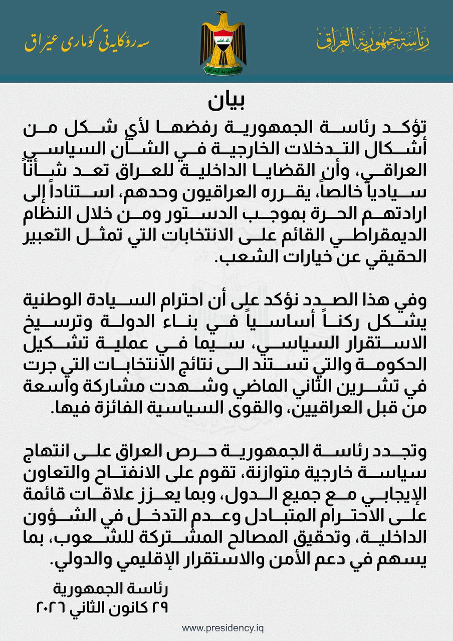 وذكرت الرئاسة في بيان تلقته ” الغدير” ، أنها”تؤكد رفضها لأي شكل من أشكال التدخلات الخارجية في الشأن السياسي العراقي، وأن القضايا الداخلية للعراق تعد شأناً سيادياً خالصاً، يقرره العراقيون وحدهم، استناداً إلى ارادتهم الحرة بموجب الدستور ومن خلال النظام الديمقراطي القائم على الانتخابات التي تمثل التعبير الحقيقي عن خيارات الشعب”.