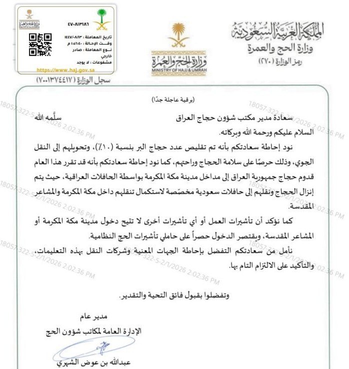 قررت وزارة الحج والعمرة السعودية، اليوم الأحد، تقليص أعداد الحجاج العراقيين براً بنسبة 10 بالمئة وتحويلهم للنقل الجوي.
