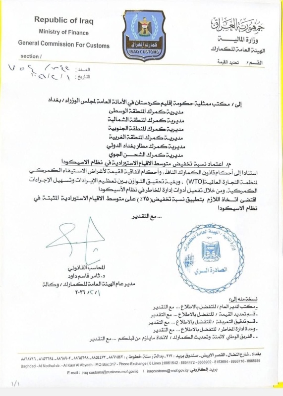 وقالت الهيئة في كتاب موجه الى عدد من مديريات الجمارك إنه “استنادا إلى أحكام قانون الجمارك النافذ، وأحكام اتفاقية القيمة لأغراض الاستيفاء الجمركي المنظمة التجارة العالمية (WTO) ، وبغية تحقيق التوازن بين تعظيم الإيرادات وتسهيل الإجراءات الجمركية، ومن خلال تفعيل أدوات إدارة المخاطر في نظام الأسيكودا، اقتضى اتخاذ اللازم بتطبيق نسبة تخفيض ( 25 بالمئة) على متوسط الاقيام الاستيرادية المثبتة في نظام الاسيكودا.